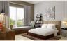 An accent wall patterned with Indian motifs lends character to this clutter free room done up in serene shades of white and brown. A vibrant royal blue single seater Ashby sofa, conveniently located near tall windows, adds a pop of color. The Walden side table is a handy addition, while the floating shelves can be used to display accent pieces. The bedside lamp and glass pendant lights softly illuminate the room once the sun goes down.