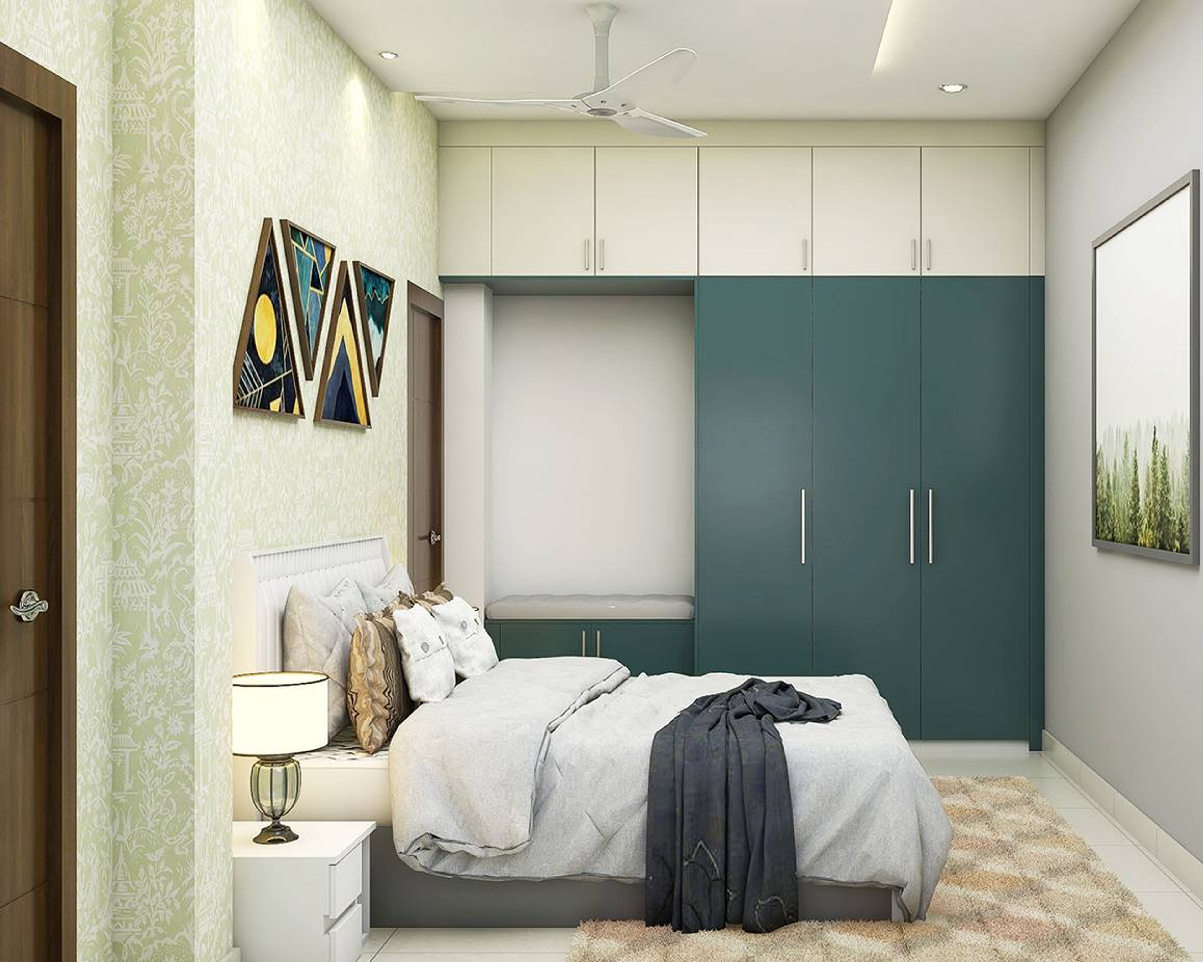A unique master bedroom design with modern decor. The painting hung on the wall with the theme looks elegant. The ambient lighting illuminates the room. The hinged door wardrobe fits in well within the space.