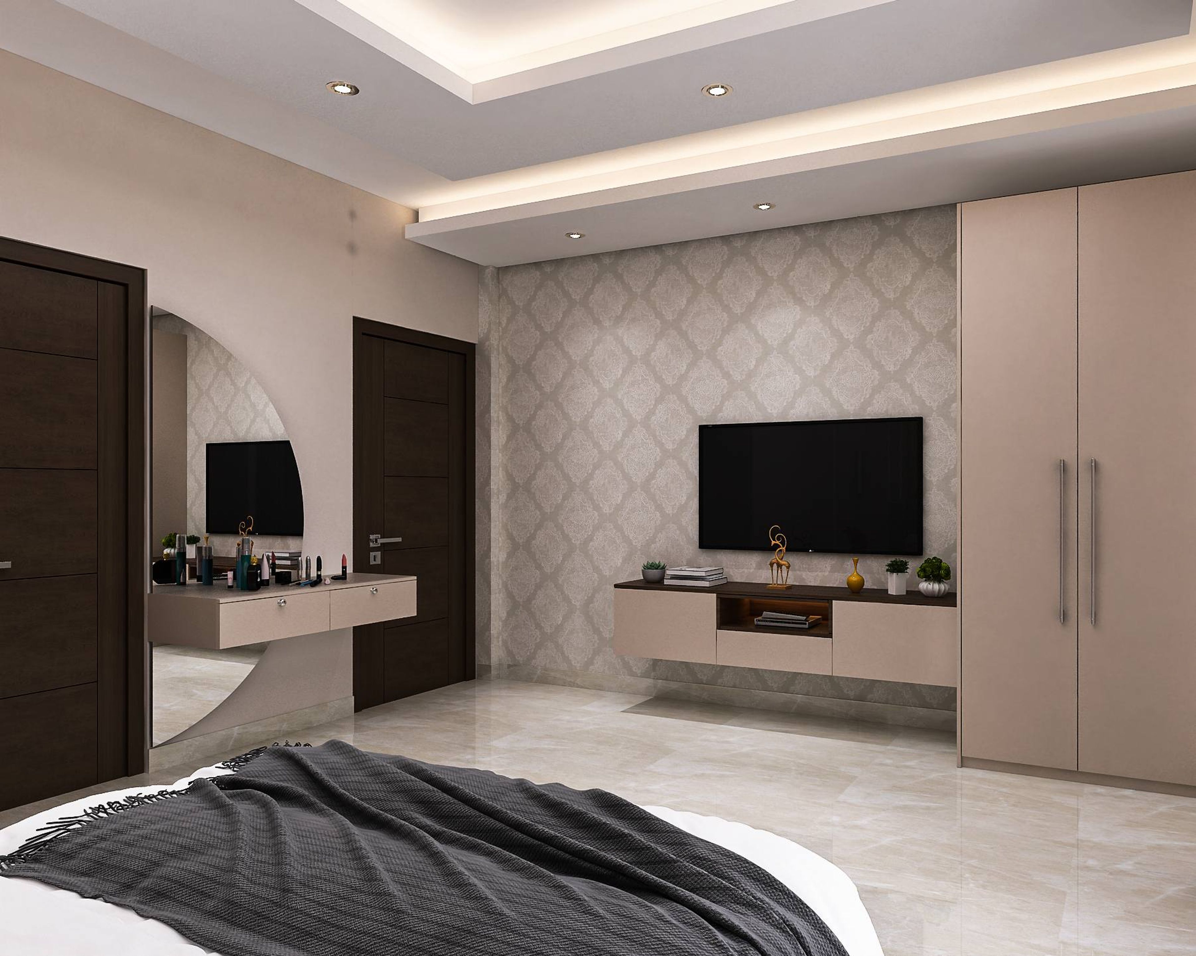 Designed with an accent wall in a unique shade and white trims, this master bedroom design takes on a modern appeal. The wardrobe offers maximum storage and matches the theme of the room. This master bedroom design has a smart placement of furniture to offer convenience and utility.