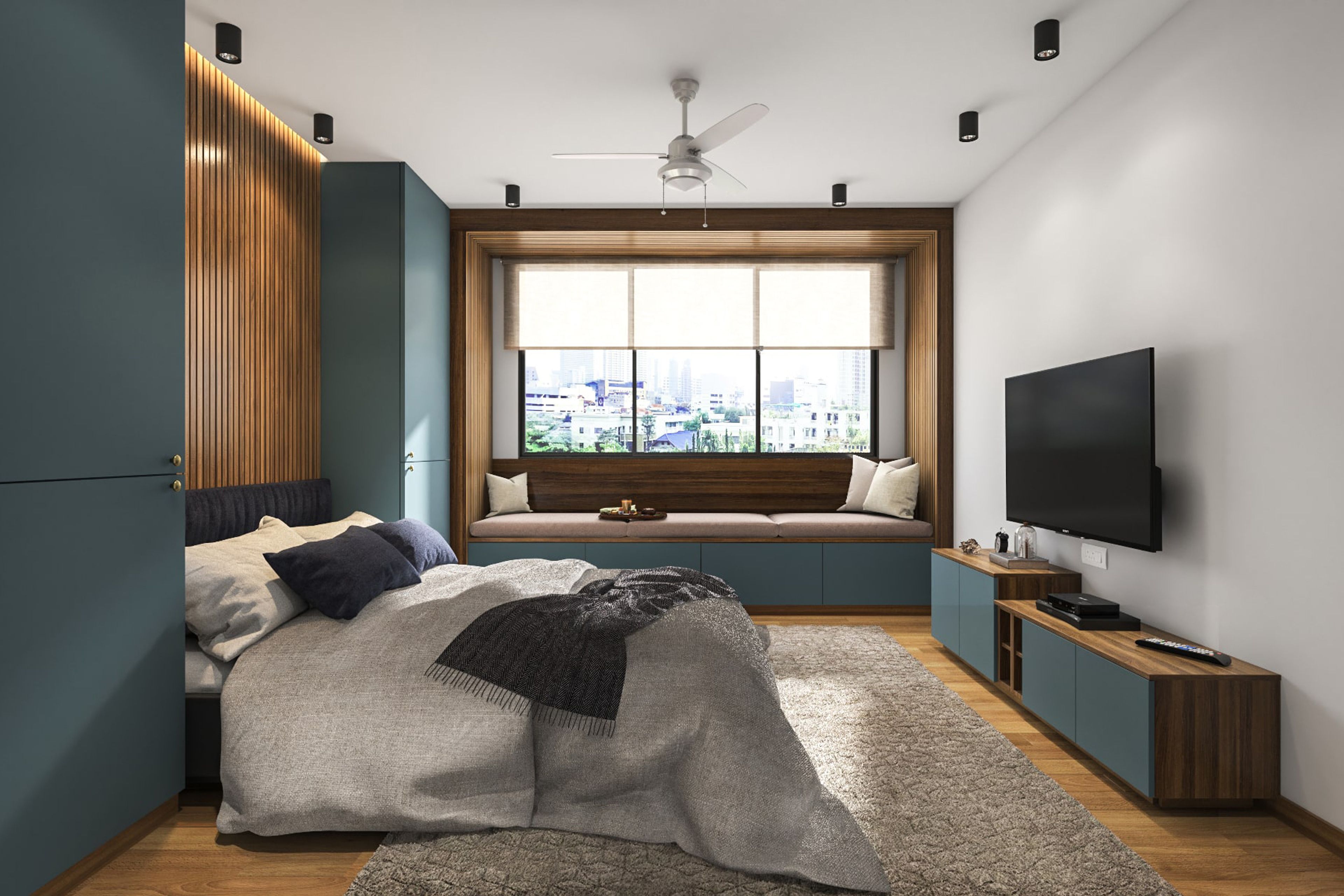 • Wall Features: Wooden rafters in bed backwall is highlighted by the neutral shades of wardrobe
