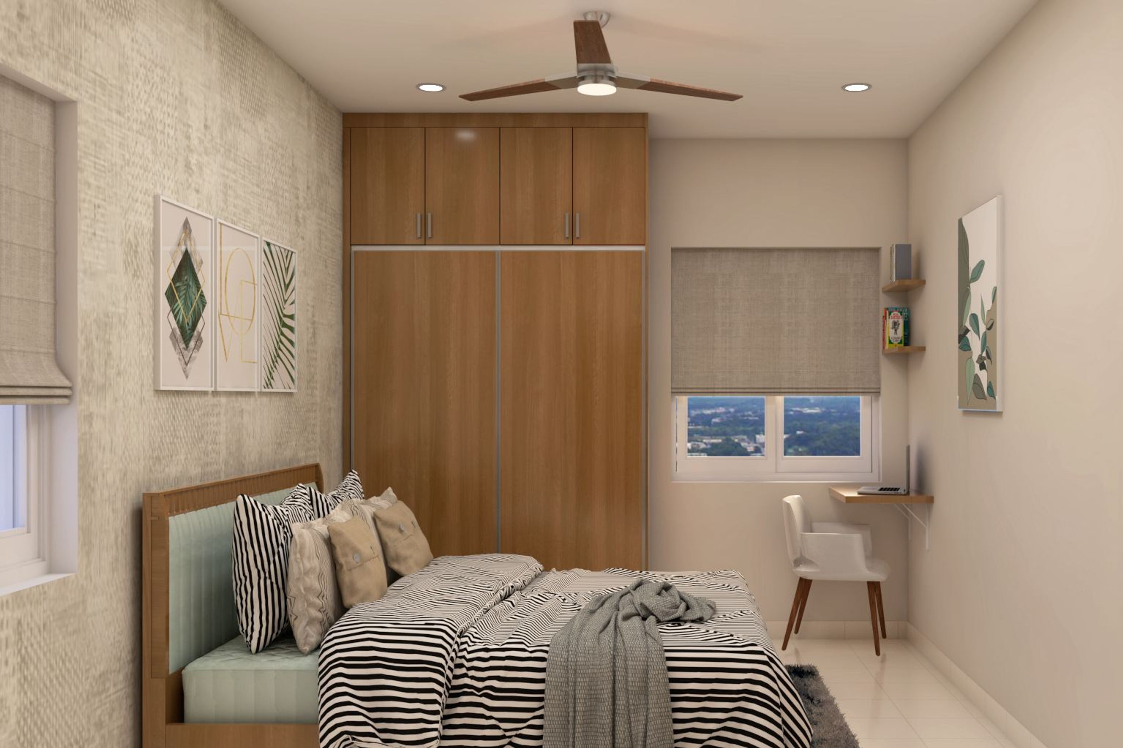 Looking for a modern and stylish master bedroom design? This one is perfect for you! Spacious and neutral-themed, it features a wooden bed with a tufted headboard. The wardrobe unit is also made of wood, and comes with loft units for added storage space. The beige textured accent wall highlights the bedhead wall and also the painting becomes the focus.