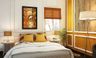 Unique wallpanelling, centered on a mustard colored wall creates an interesting vibe in this bedroom.The luxurious Sagrada queen size bed flanked by two Port Aventura bedside tables forms the focal point. On the other side of the room, a Rafael foyer unit is paired with a Luis sideboard and Gerardo armchair to provide storage and seating.