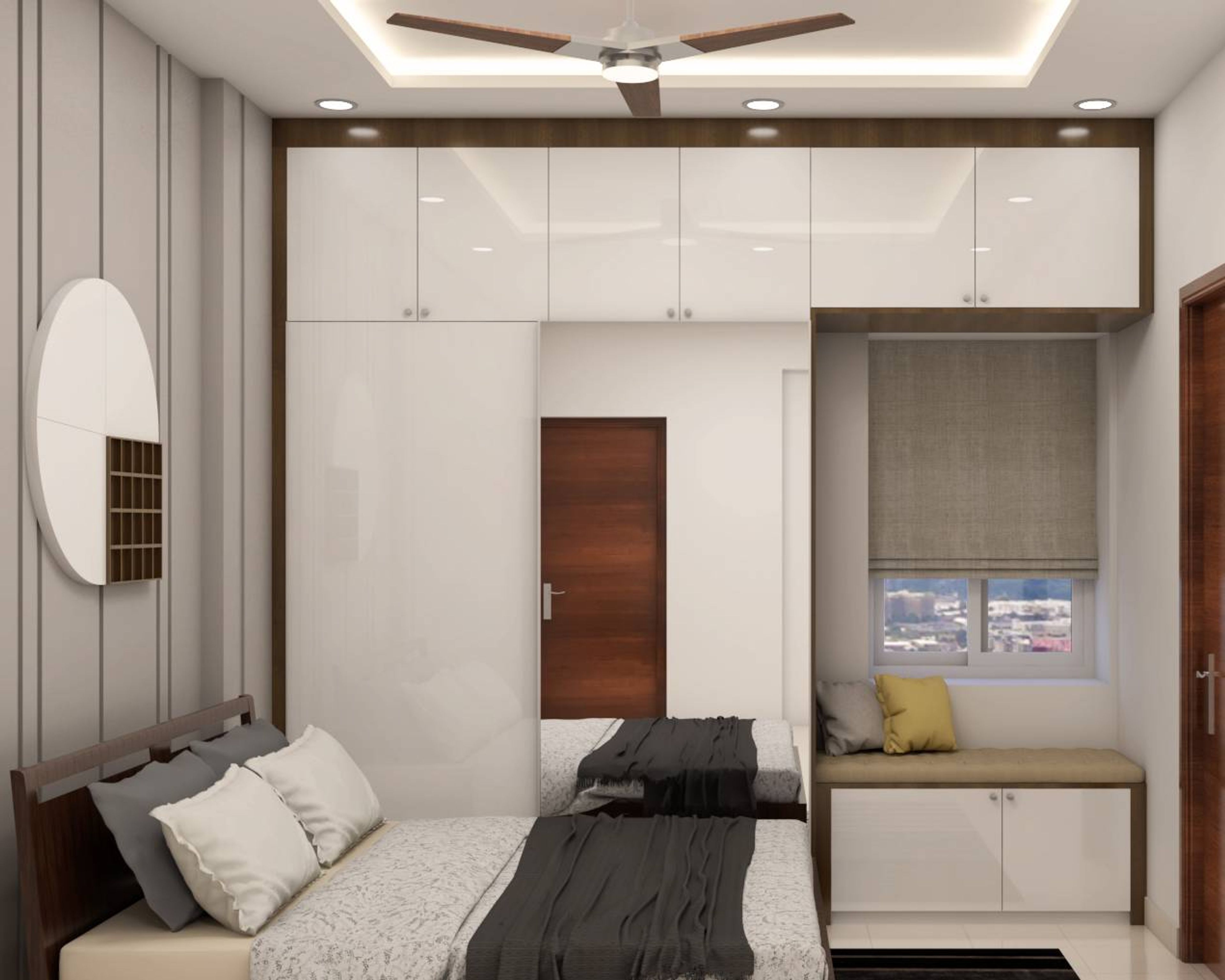 This master bedroom design is modern and spacious. The round mirror on the accent wall with grey trims looks lovely. The sliding door wardrobe fits in perfectly. The small seating space next to the cabinet is added for convenience.