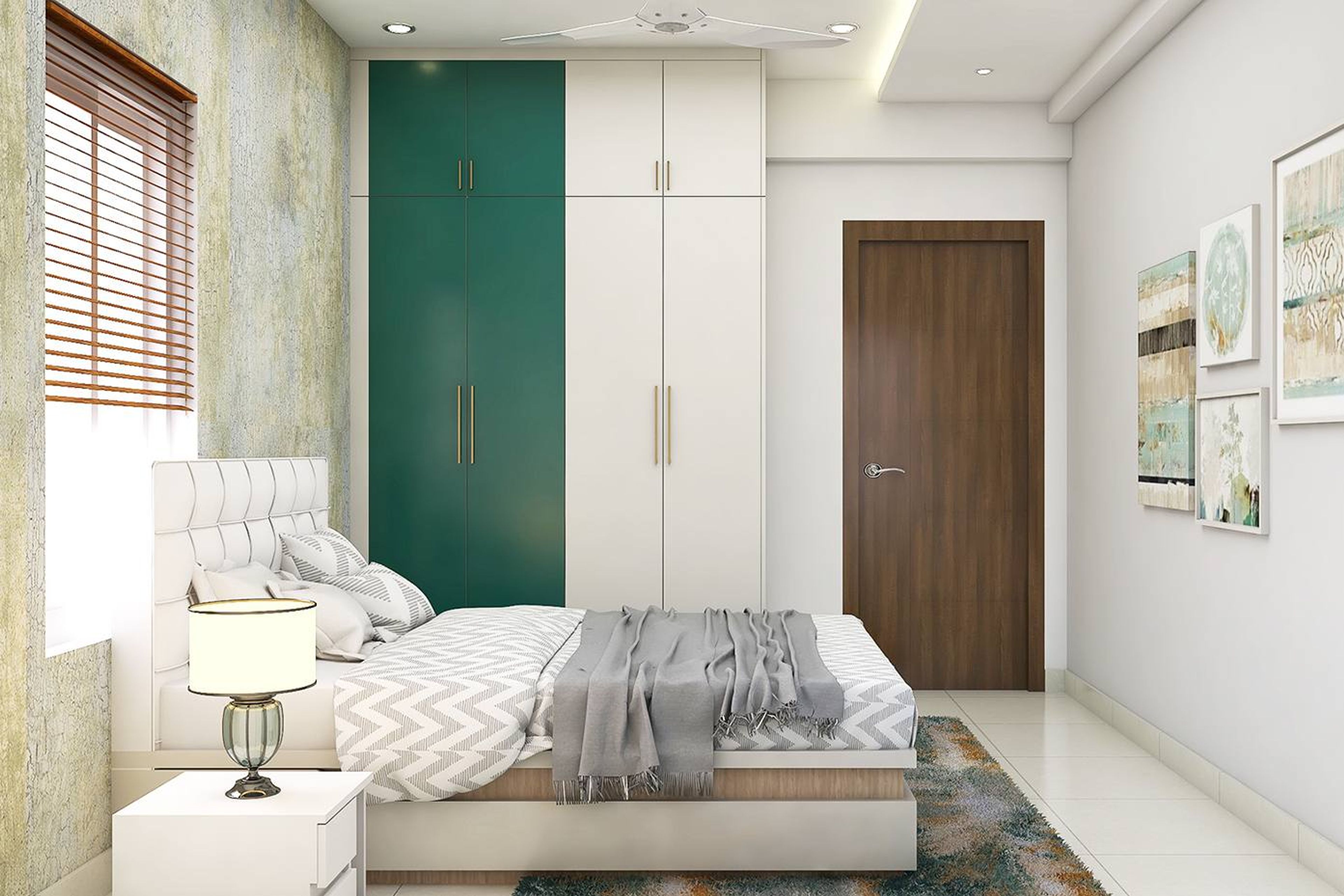 This spacious master bedroom design is an ode to modern design with its white bed and tufted headboard. An accent wall with texture paints adds interest to the décor and provides an excellent contrast to the furniture. A wardrobe in a green and white combination has additional lofts and offers ample storage space.