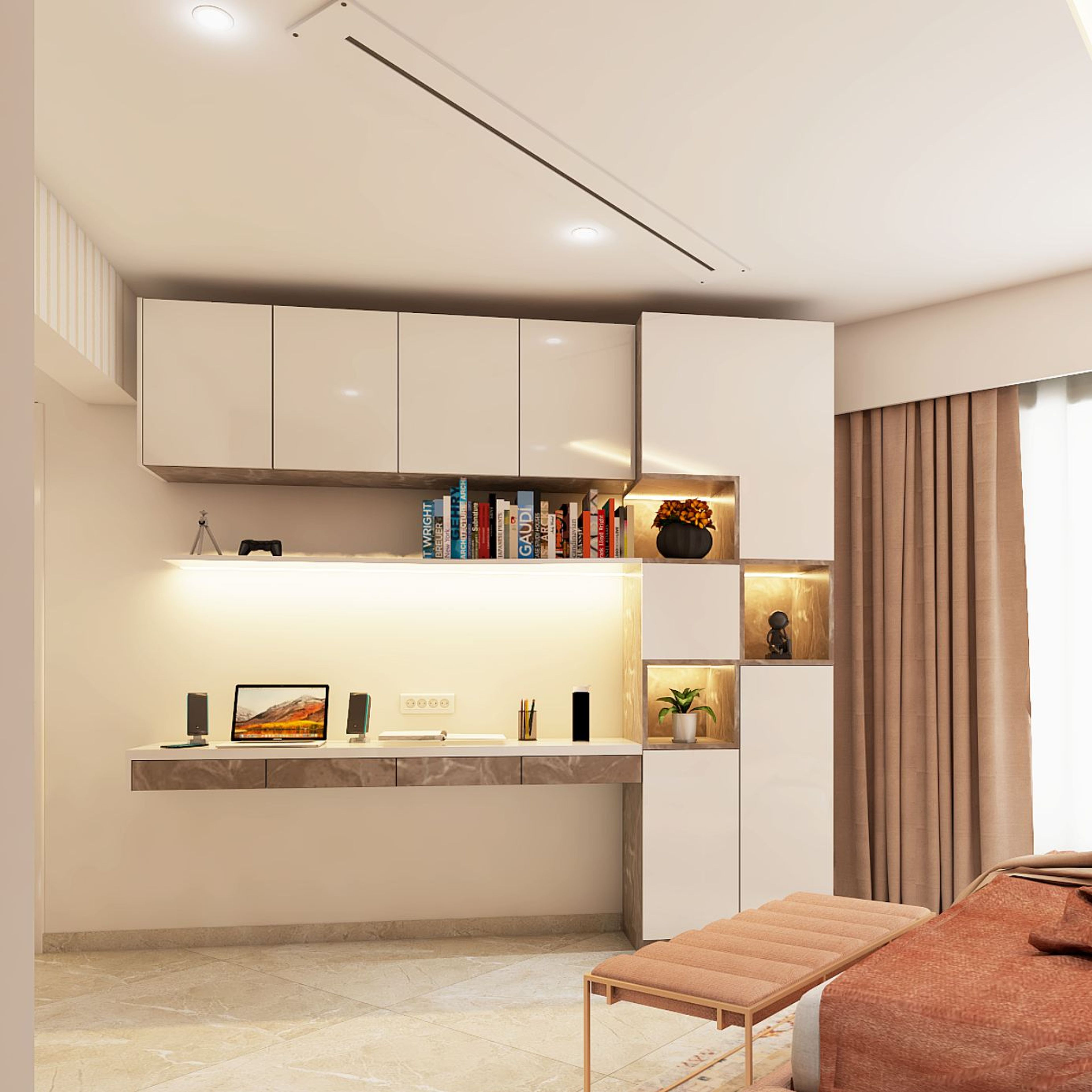 Ready to take your bedroom design to the next level? This peach contemporary themed master bedroom design is just what you need. With a full height headboard and LED lighting, this design is sure to make a statement. The U-shaped false ceiling design provides an elegant look, while the wall mounted table and storage is perfect for both display and study purposes. The sofa bench with brass finish legs completes the look and adds a touch of glamor.