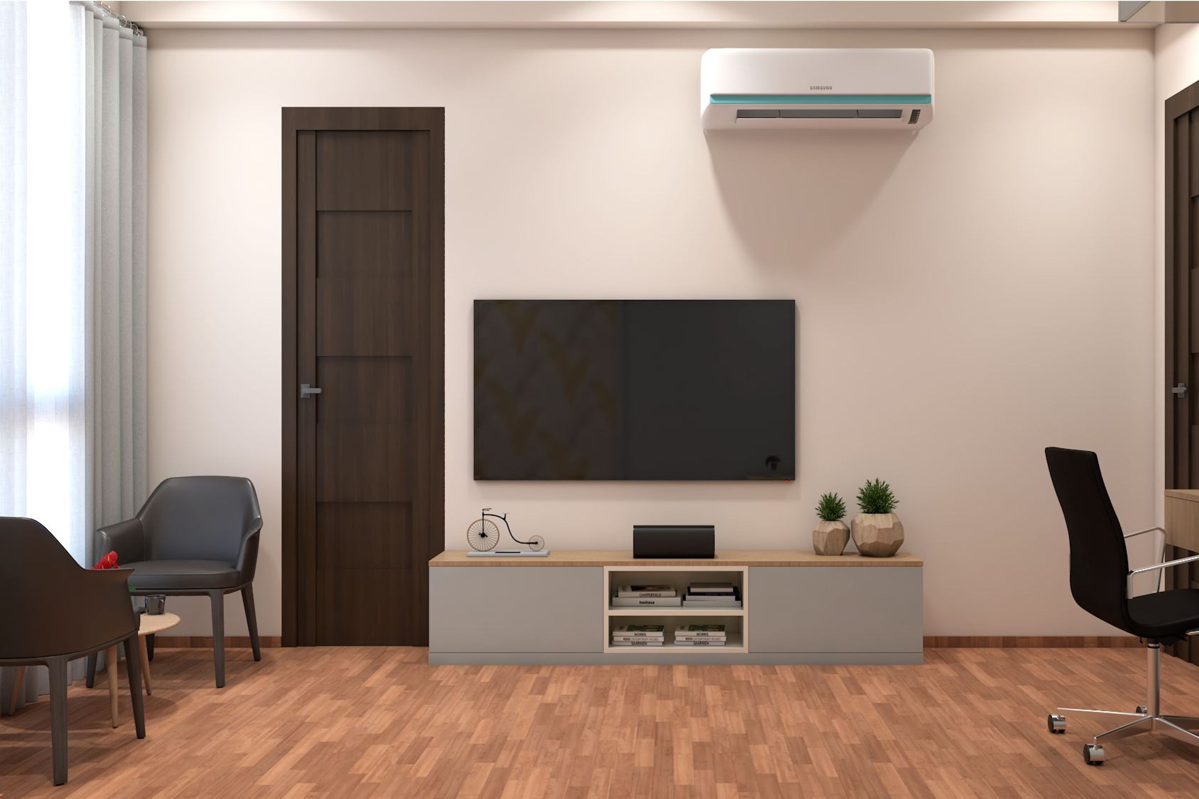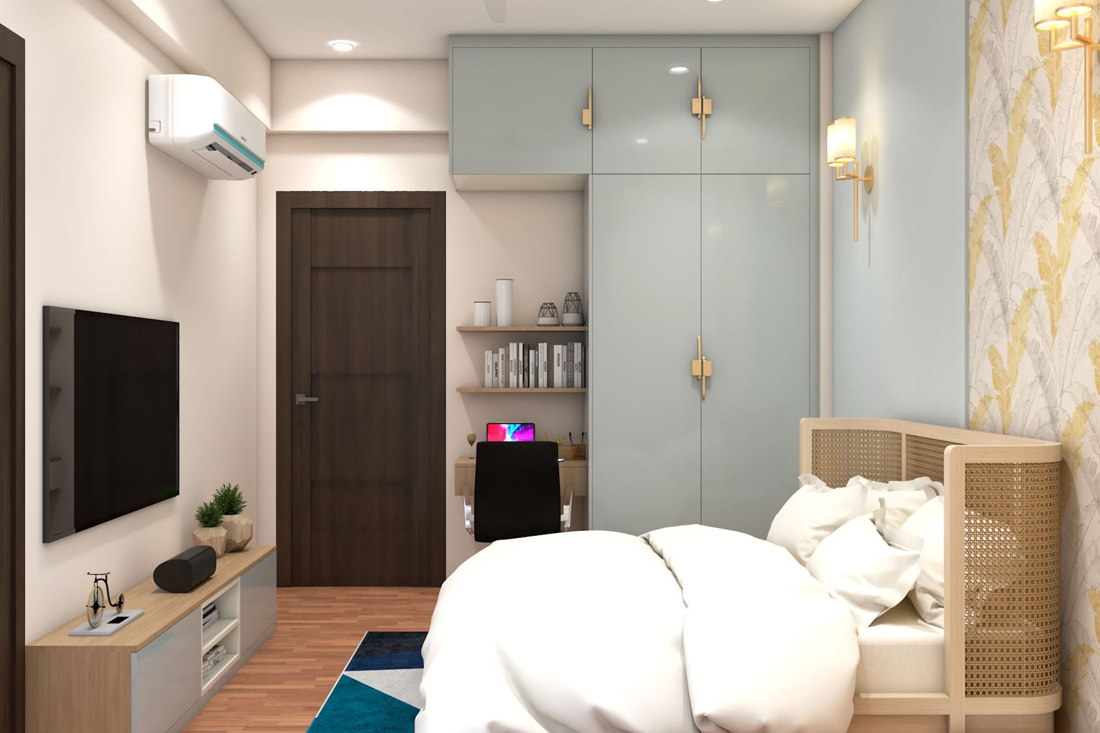 Make a stylish choice with this bedroom design that has a yellow and white wallpaper section on the accent wall. The wardrobe has a light blue finish that matches the wall. This room is multifunctional with a study desk and chair. For additional use, the room includes a tea table and chair.