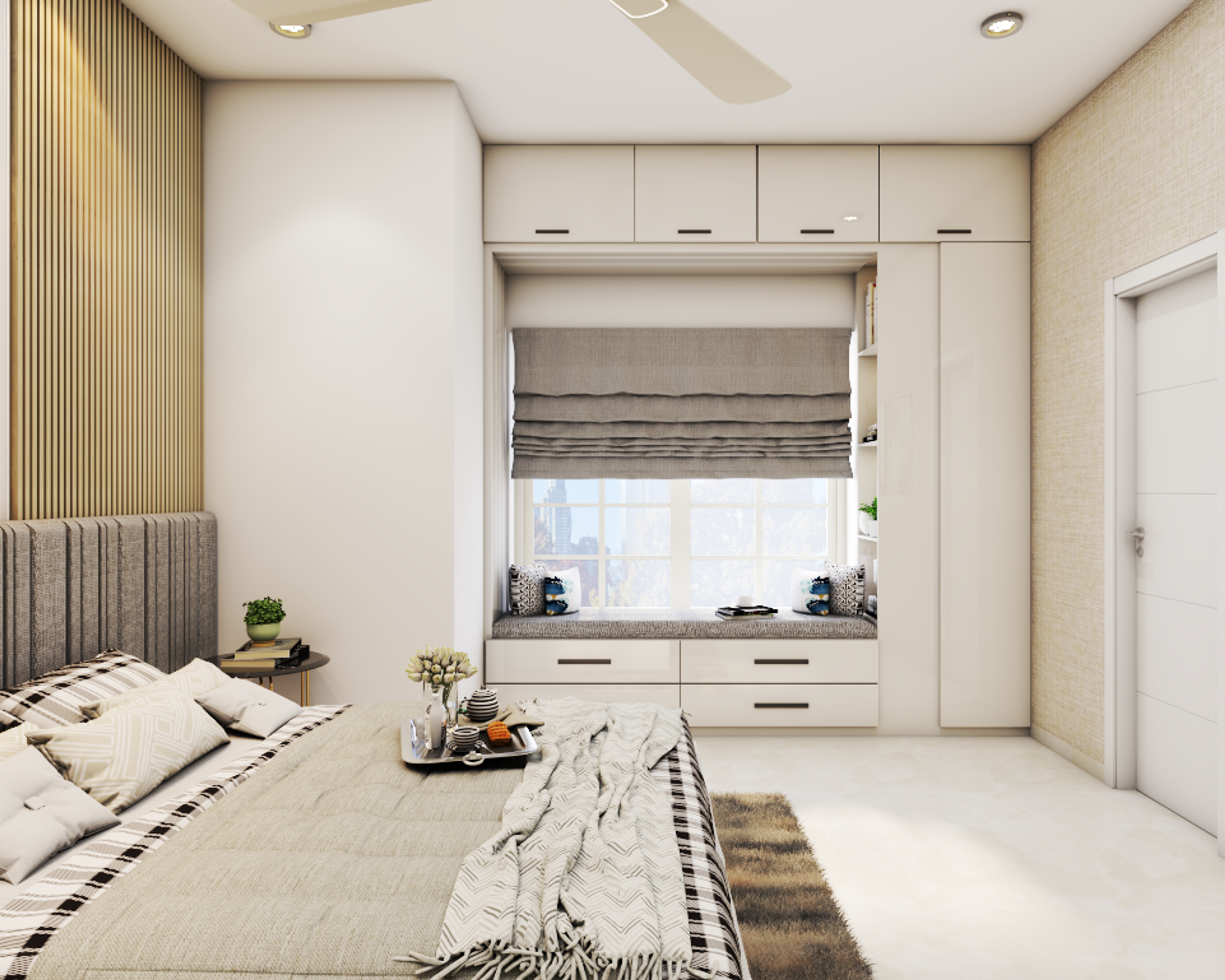 The creamy white upholstered bed and the grey tufted headboard throughout the wall length emphasise the contemporary style of this bedroom. The plain white painted accent wall with trims on one side adds to the sleek look. The white finished wardrobe with mirror paneling on the sliding door adds to the style of the room.