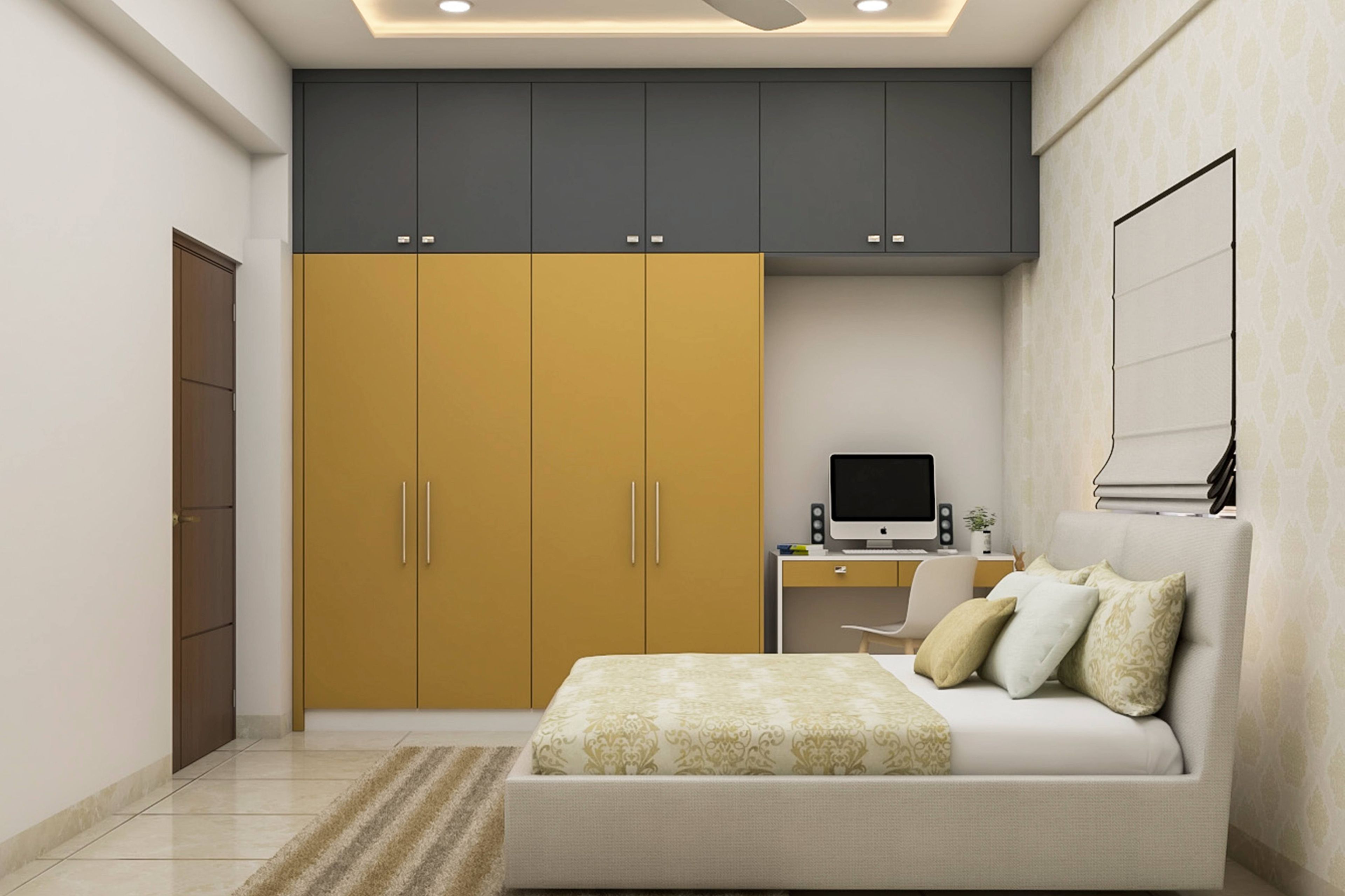 Bringing to you convenience, comfort and style, this master bedroom design is a modern one that will upgrade your standard of living. The large wardrobe frame offers a good amount of storage space and includes a study unit as well. This master bedroom design has a large bed with a light finish that complements the subtle pattern on the accent wall. This bedroom is spacious and has a rug that defines the appeal.