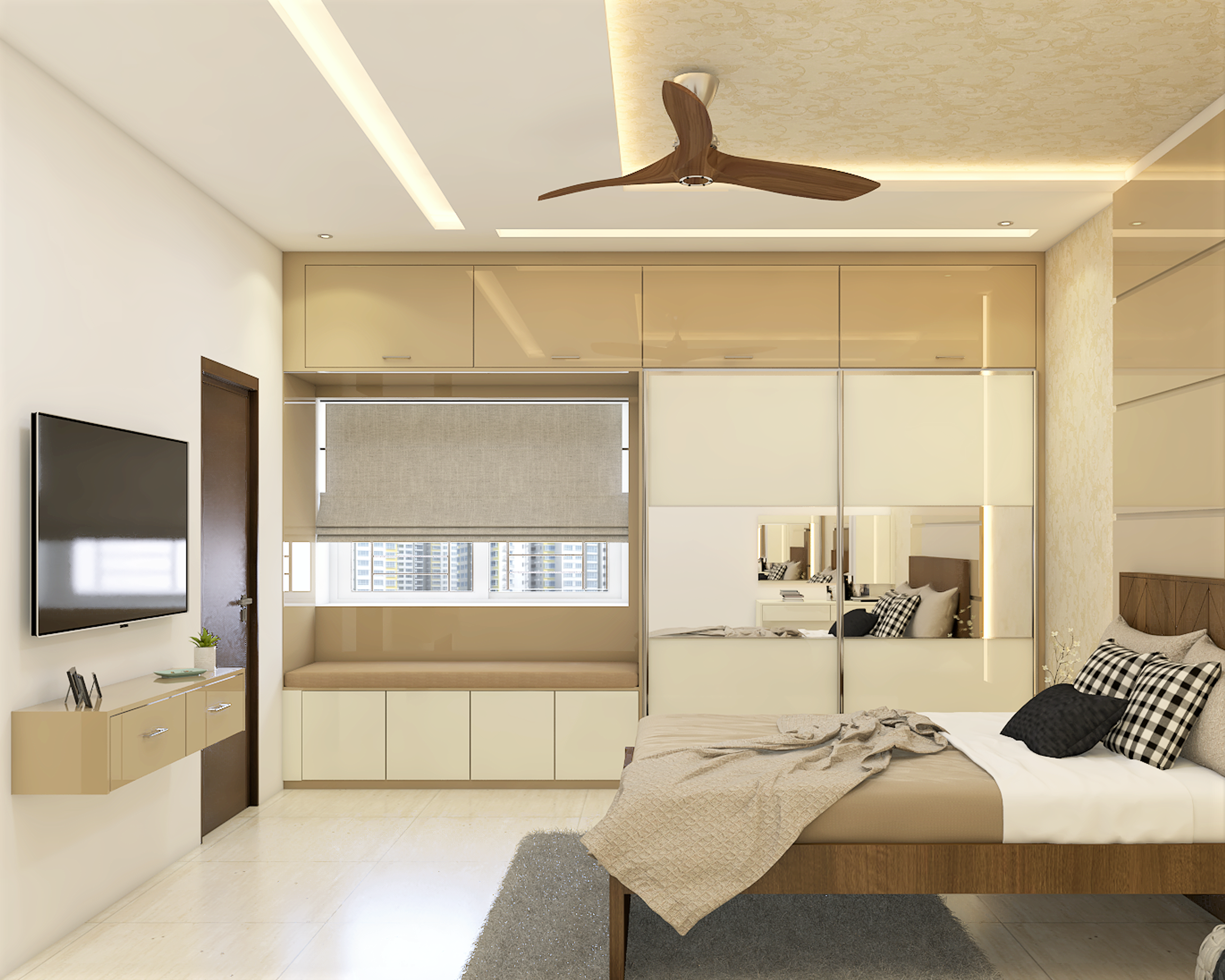 A soothing getaway, the warm colour palette of this modern master bedroom makes for a serene and striking space. A bed with a back panel ensures your room stands out from the rest. The cove lights extending to the ceiling accentuate the beauty of the wallpaper, creating a sense of depth and drama. A sliding wardrobe with lofts, a bay window storage, and a seater gives you all the room to store your clothes without taking up an enormous amount of floor space. The perfect solution to space constraints is the compact TV unit with wall-mount storage that helps you easily store your TV accessories.