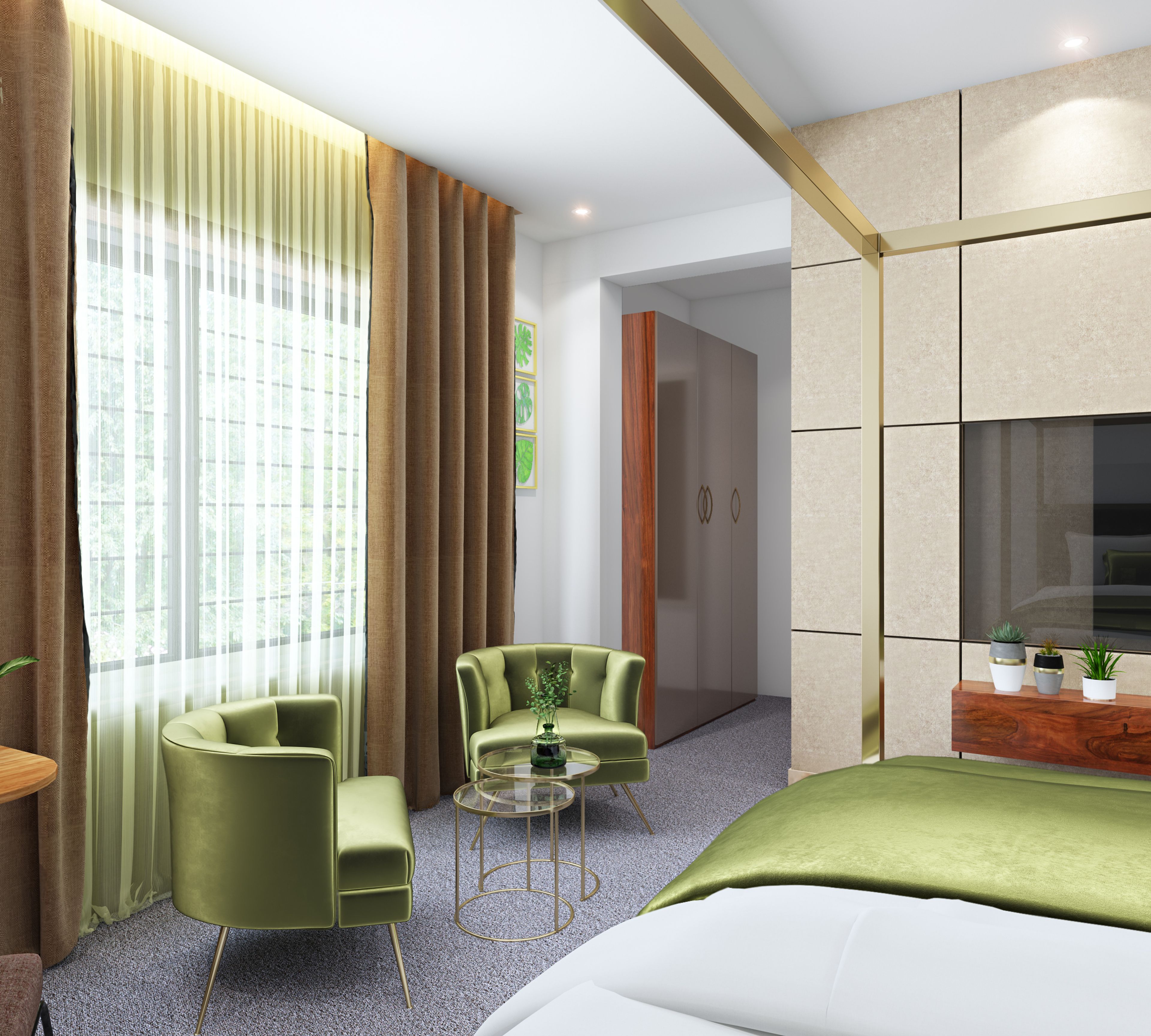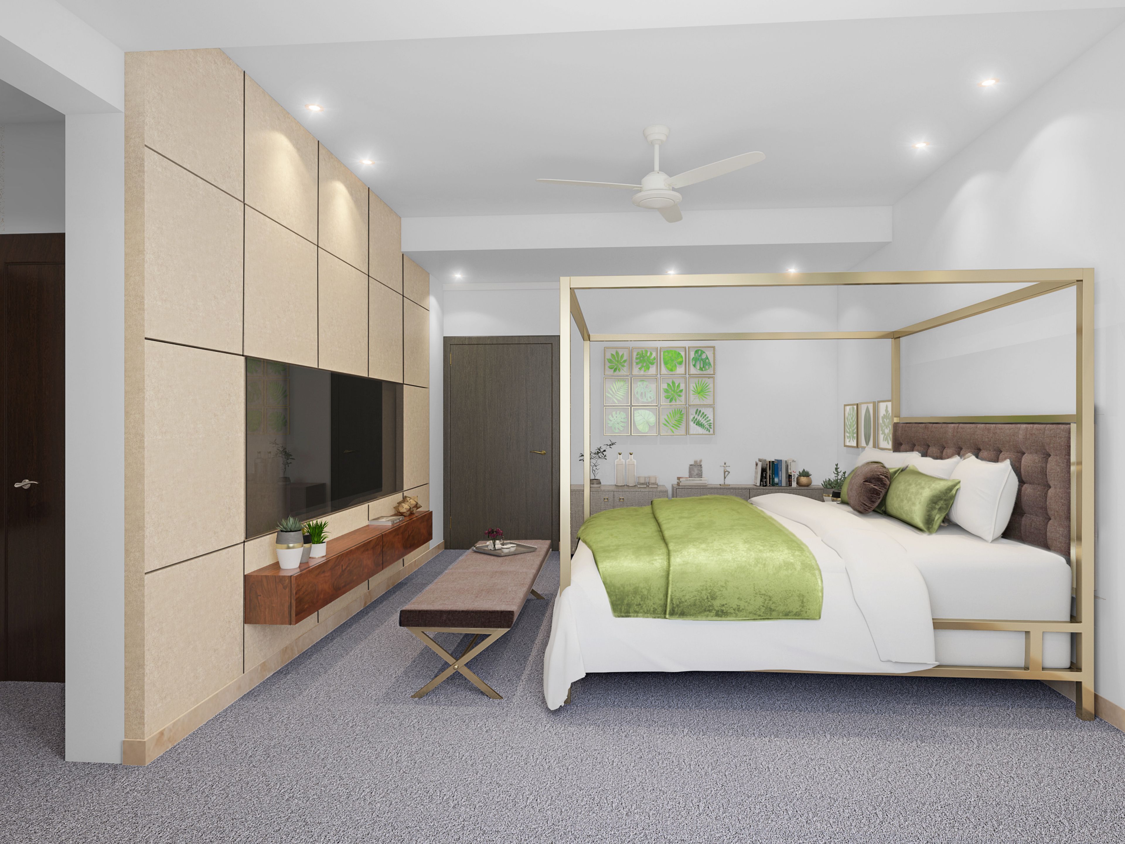 A stunning bedroom pepped up with metallic accents to give it an upscale feel.