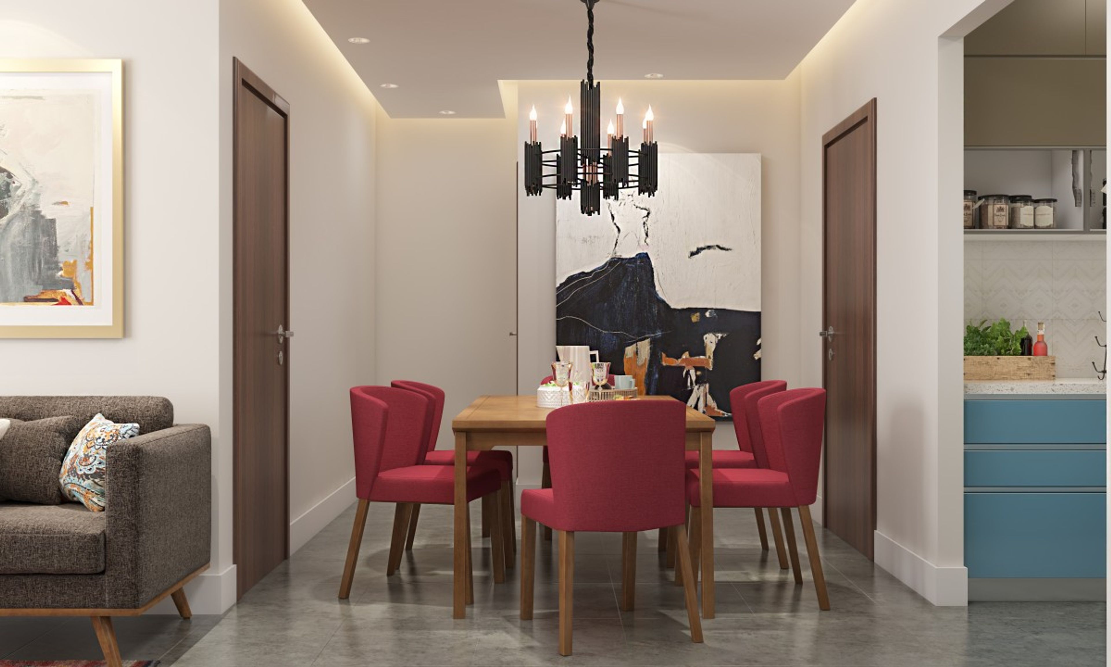Dine in style in this elegant and contemporary dining room that makes every meal, a meal to remember.   The classic Eleanor 6-seater keeps things simple, while the stylish candle stand chandelier brings in some oomph, The curvaceous armless dining chairs introduce a pop of melon-y pink into the otherwise polished space.