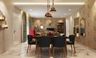 Doused in monochromatic tones, this dining room is as refined as ever. Chic lighting and a blend of textures elevates the charm of this cozy corner.