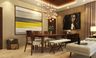 With a stylish flight of stairs and industrial lights, this dining area boasts modern character like no other. Simple white dining chairs complement the powder blue storage cabinets and a dynamic rug helps ground the space.