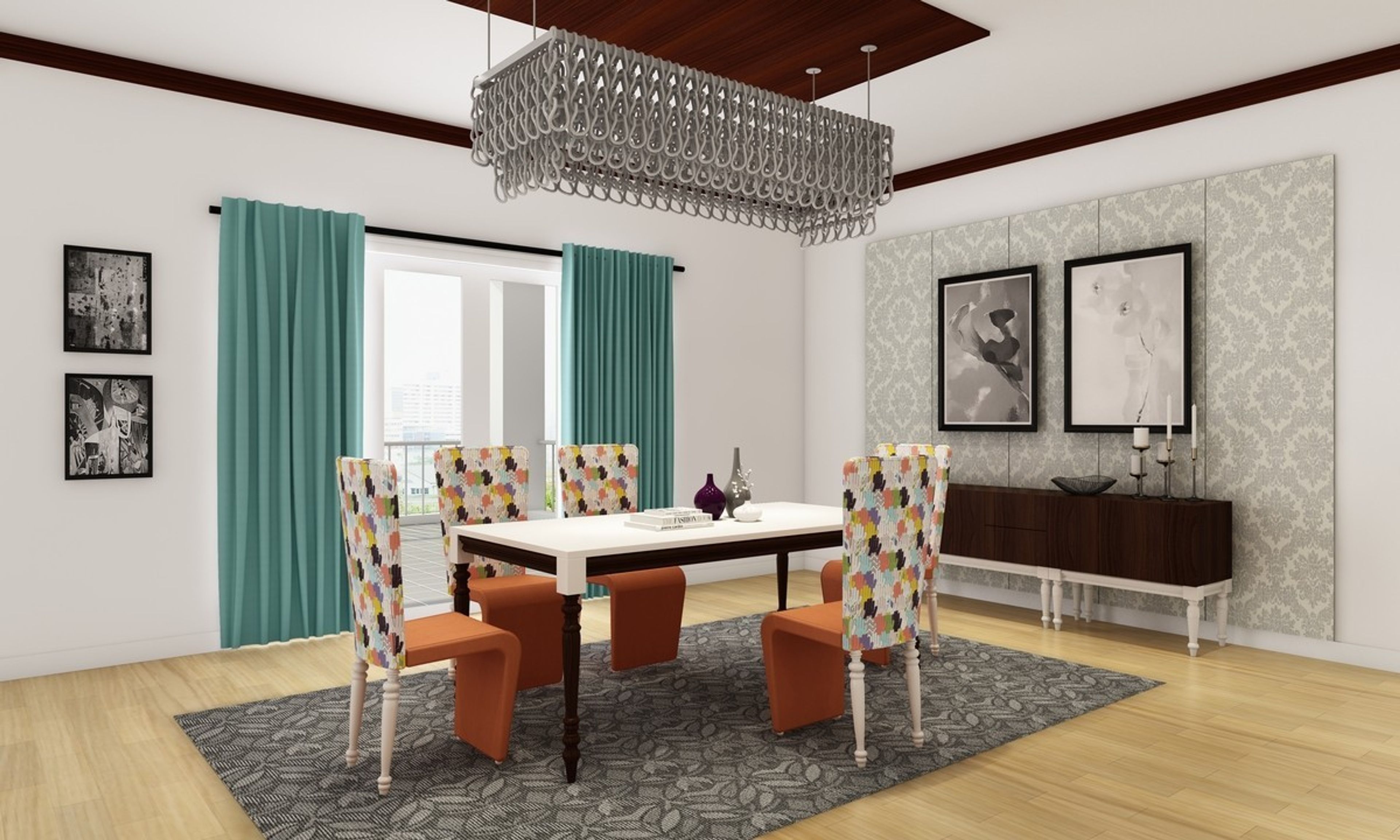Home/.../Dining Room/Classic 5-Seater White Dining Room Design With Multicoloured Chairs