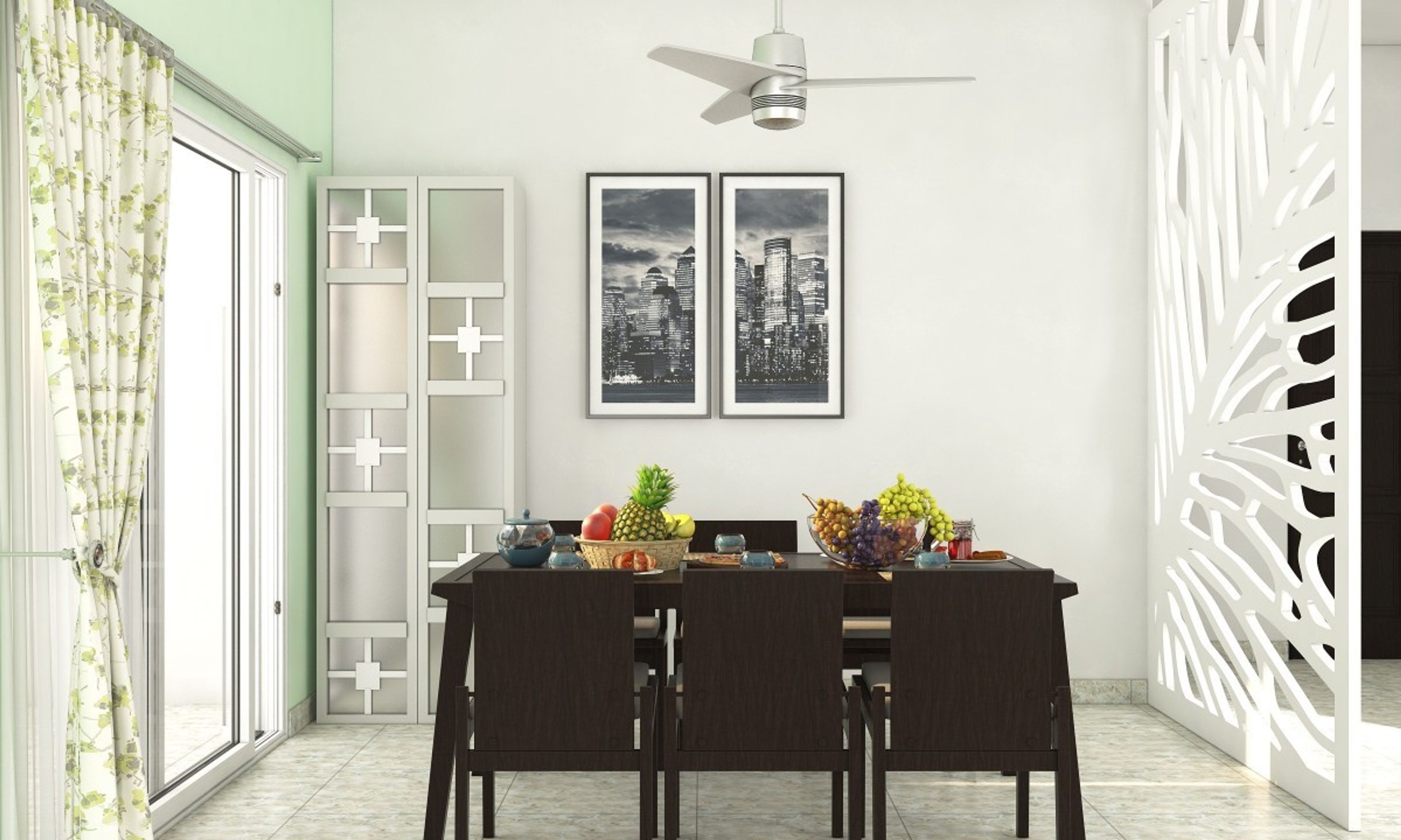 This perfectly pulled together space enjoys the clean lines of the Eleanor table and Grafton chairs against a mint green backdrop. The stark black and white prints complemented by the metallic crockery unit and fan usher in some visual energy. The sheer curtains and leaf-patterned drapes embolden the hue of the accent wall, keeping things fresh and simple.     . .