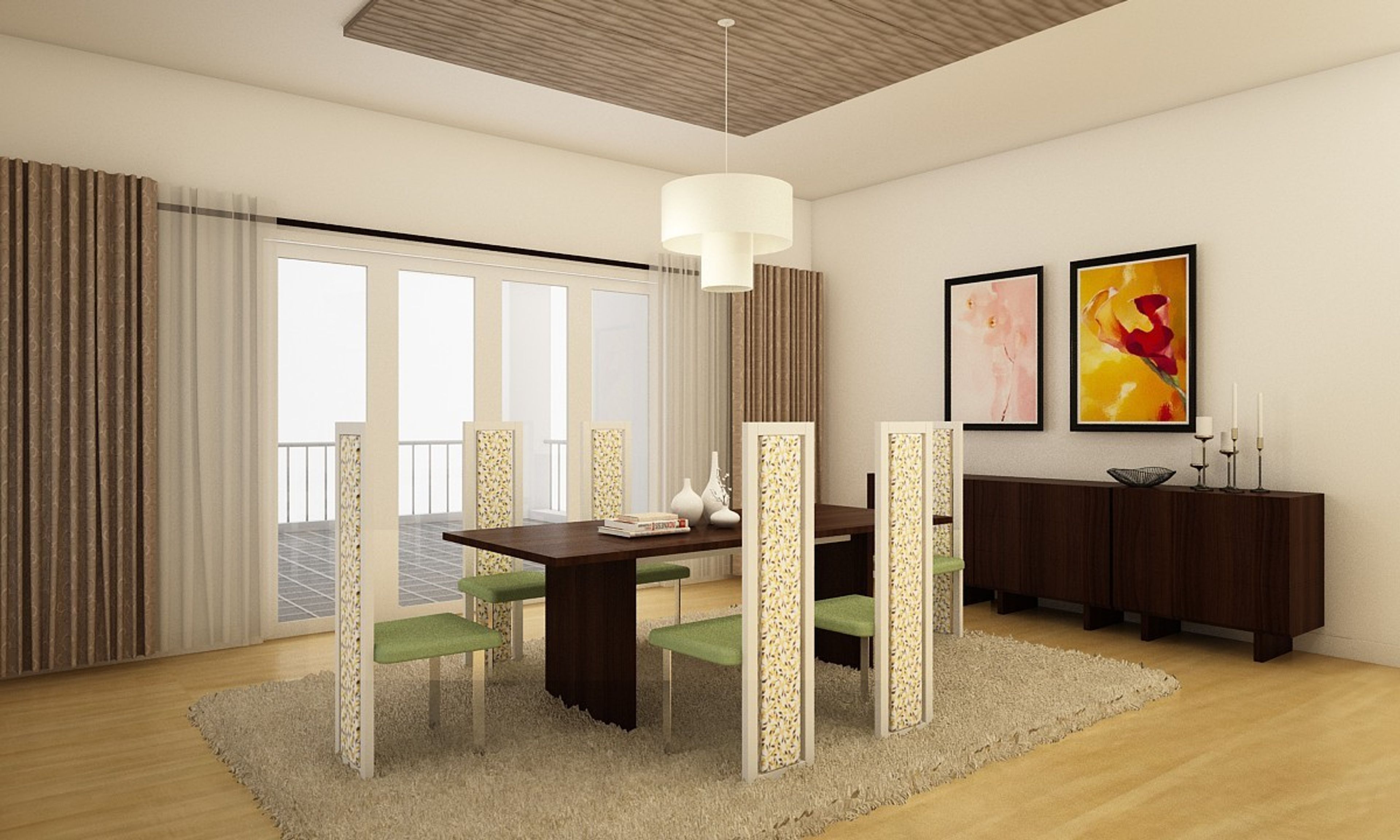 Classic 6-Seater Wooden Dining Room Design With Oranate Green Chairs
