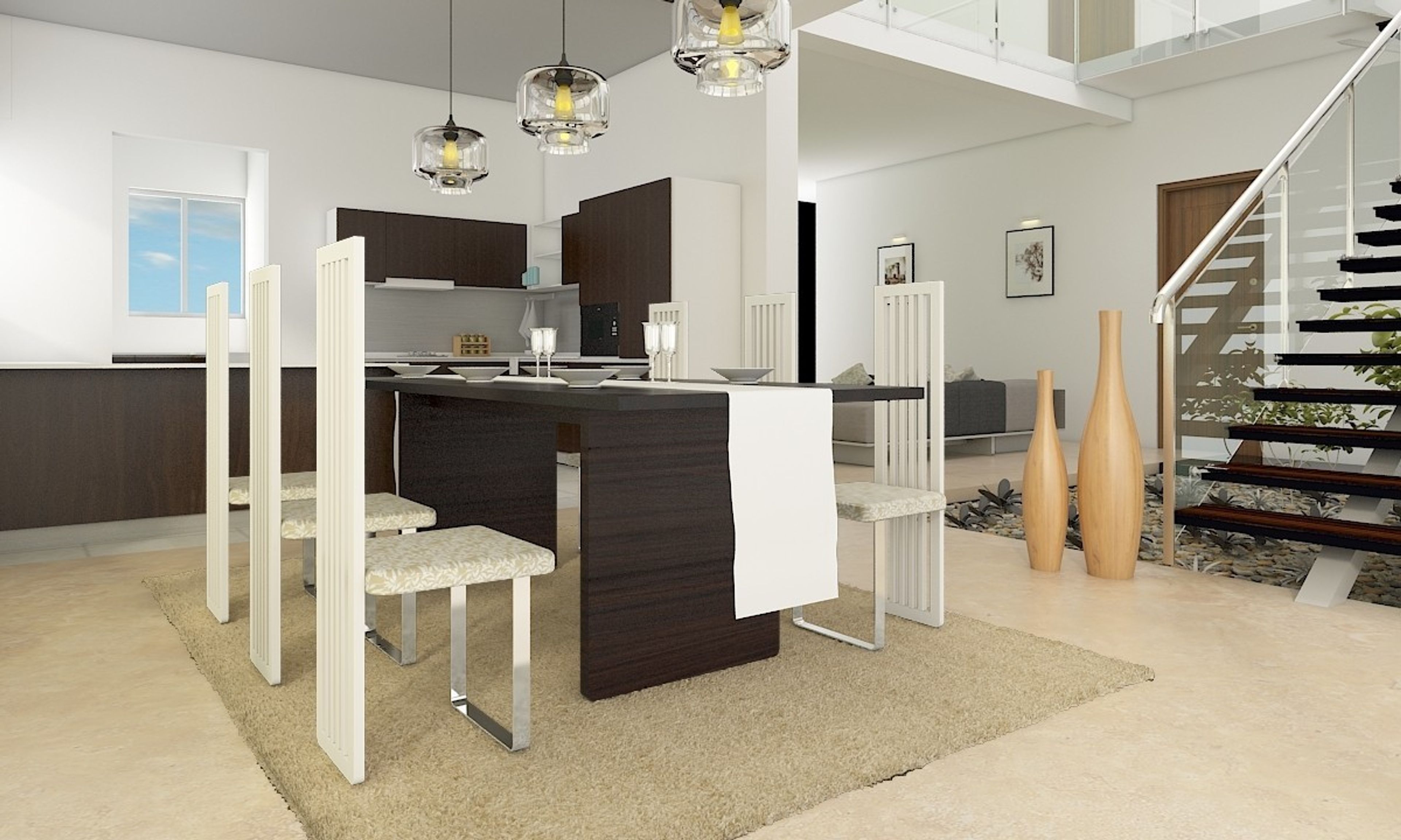 This modern dining room uses a classic colour scheme and has an unmistakably quaint country feel.The finishing on the table and the detailing on the backrest of the dining chairs is reminiscent of traditional wooden surfaces and picket fences.The furry rug and patterned fabric upholstery on the chairs softens the look.