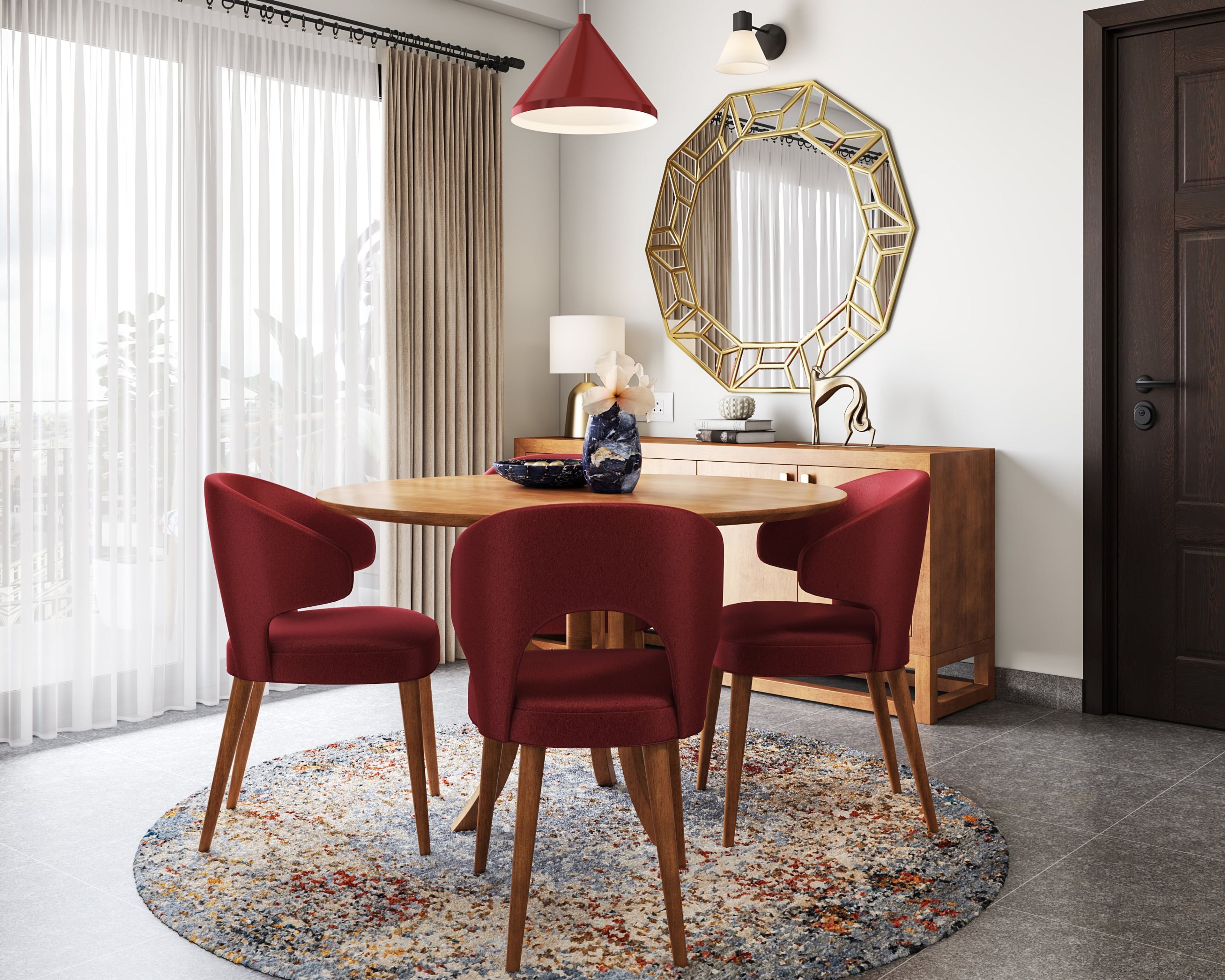 • Furniture Highlights: 4-seater round wooden dining table with red upholstered chairs