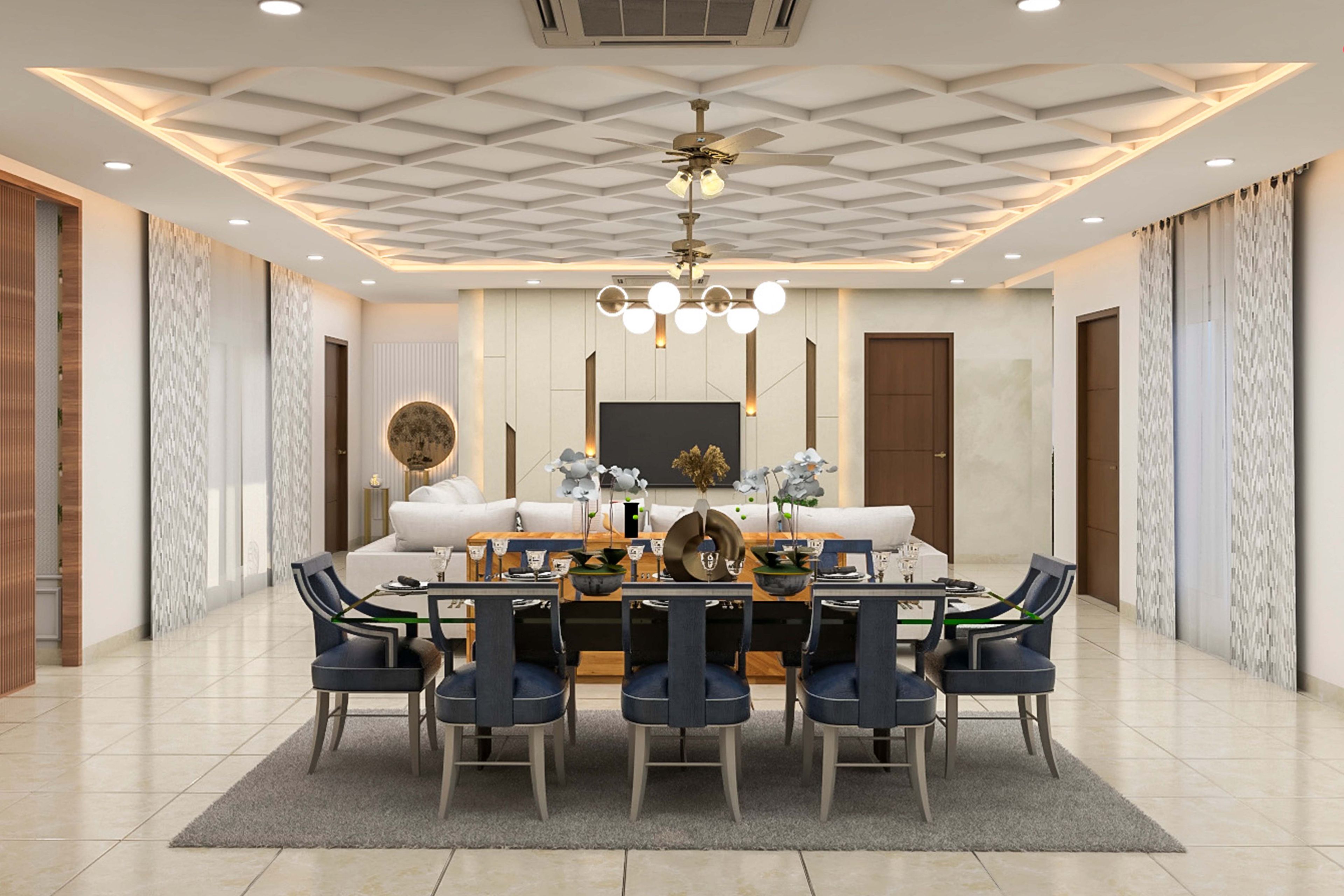 Perfect for a big family, this spacious dining room design comes with eight chairs. Sporting an elegance, the chairs are upholstered in a shade of blue. The dining area has a large crockery unit with translucent shutters so that your crockery can be displayed. Designed with convenience in mind, this dining area also has a wash basin.