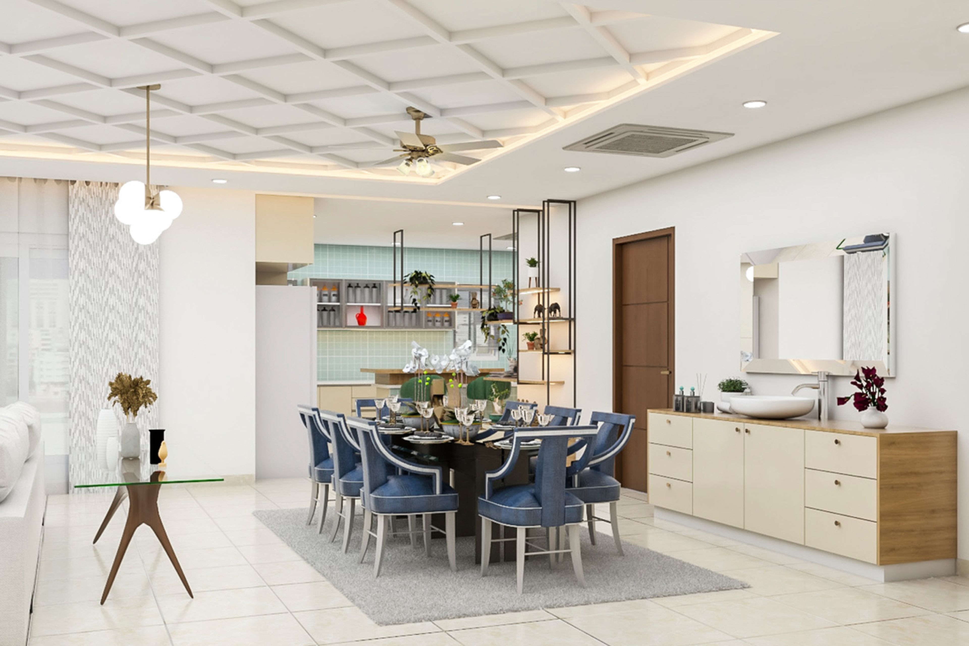 • Furniture Highlights: 8 seater glass countertop dining table set with blue upholstered chair