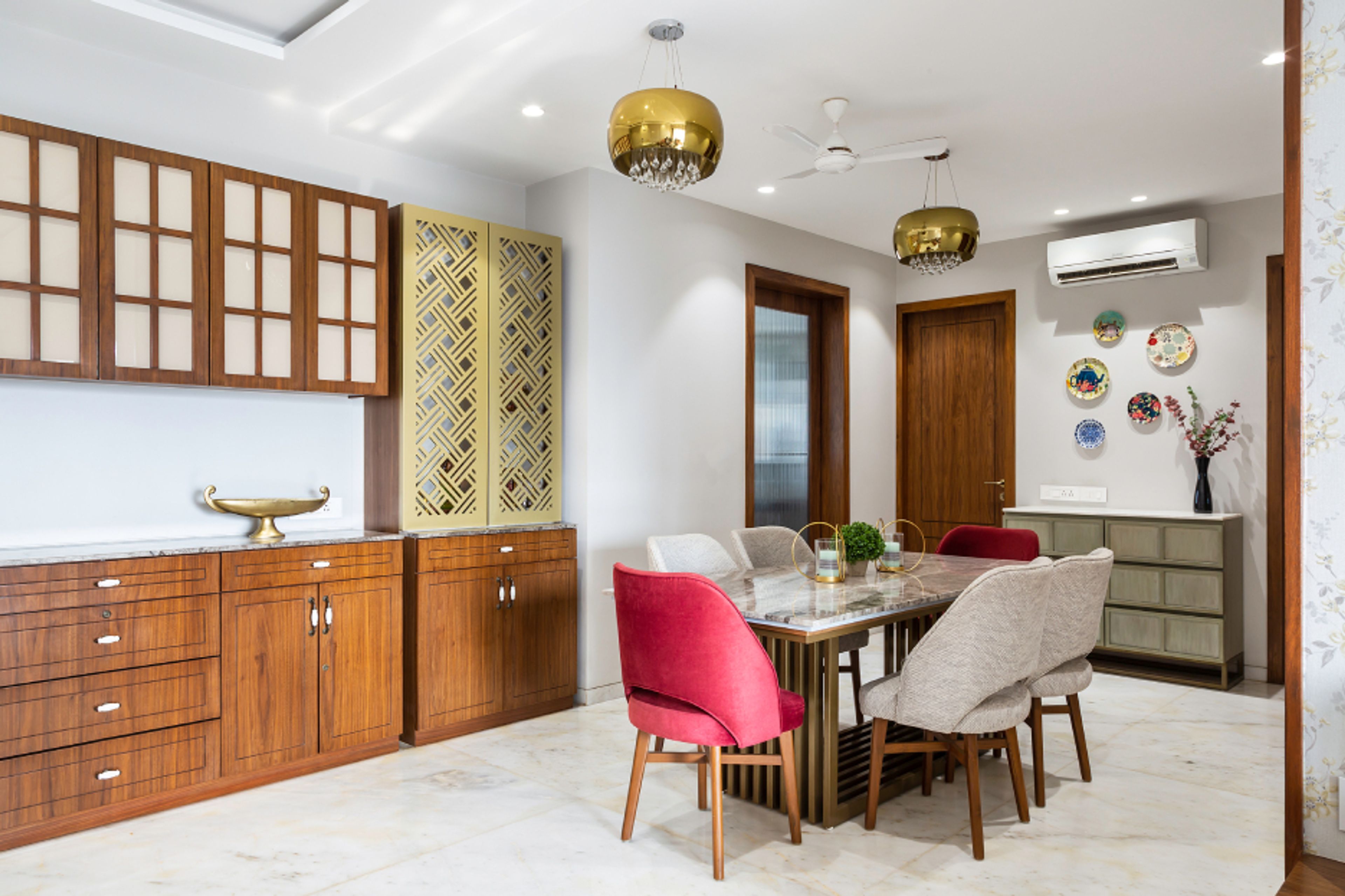 • Furniture Highlights: Red velvet chairs complement the clean white palette of the dining room