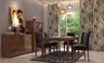 A clever choice of muted hues, wall motifs and plenty of light meet to create this dynamic dining space.   The woody elements like the Lumen unit, the Empresa dining table and the wall mounted cabinets give this space an earthy feel. The brass pendants exemplify the beauty of the mustard and emerald dining chairs.