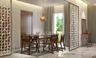 The dining room feels fresh with the vigour of crisp white walls clinched by pastel hues that exemplify the look.     The extensive french windows are dressed in floor-to-ceiling drapes that mimic the subtle pops of the Scandi-inspired dining chairs. Making a statement through its rich woody tones are the Takara sideboard and Savannah dining table.