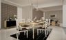 Give a fresh look to your living space with this beautifully created Dining Room. The classy furniture brings a touch of sophistication to your house. The lime color on the wall panels and carpet adds to the serene and elegant atmosphere. Ivory colored furniture is the perfect offset for this look.