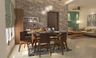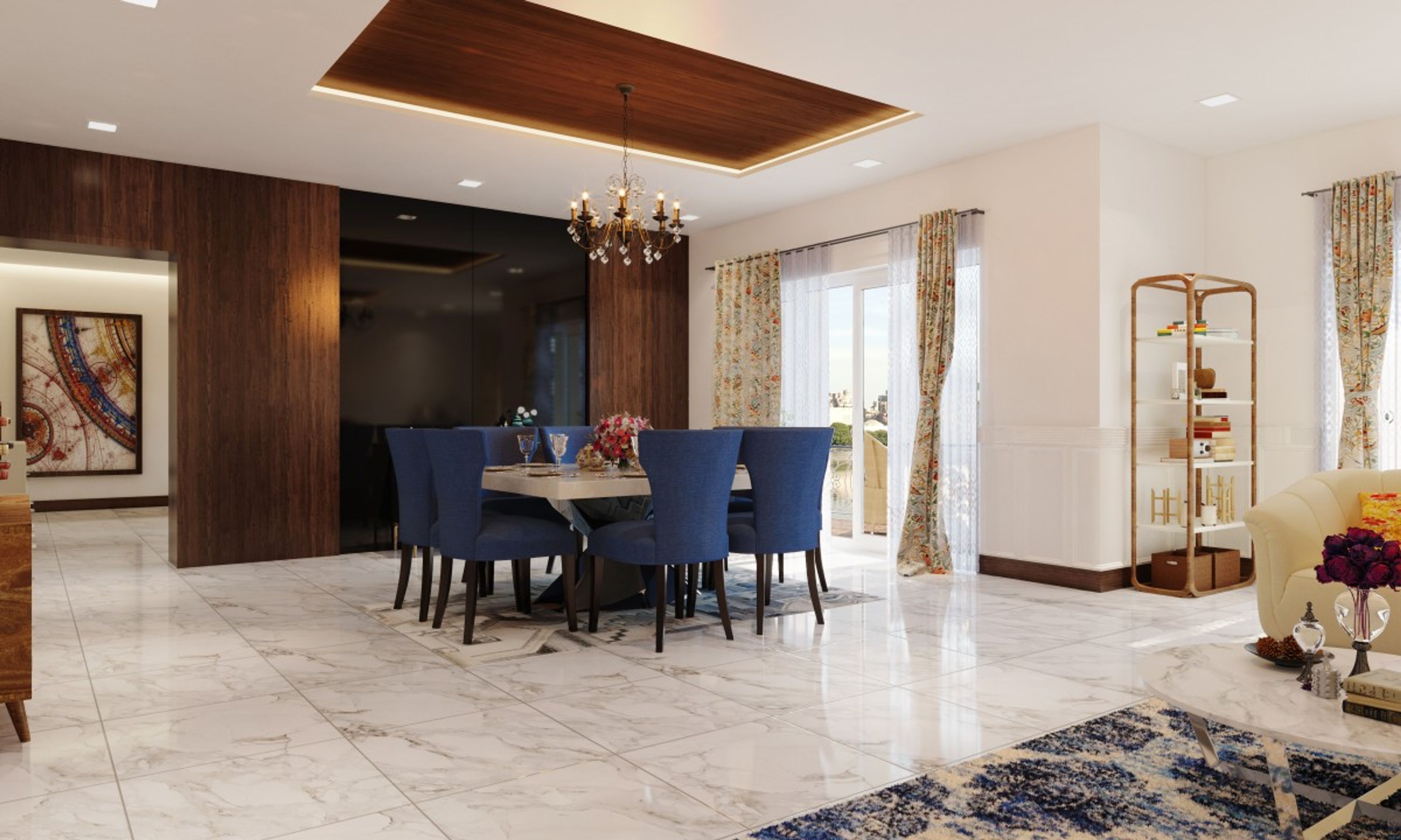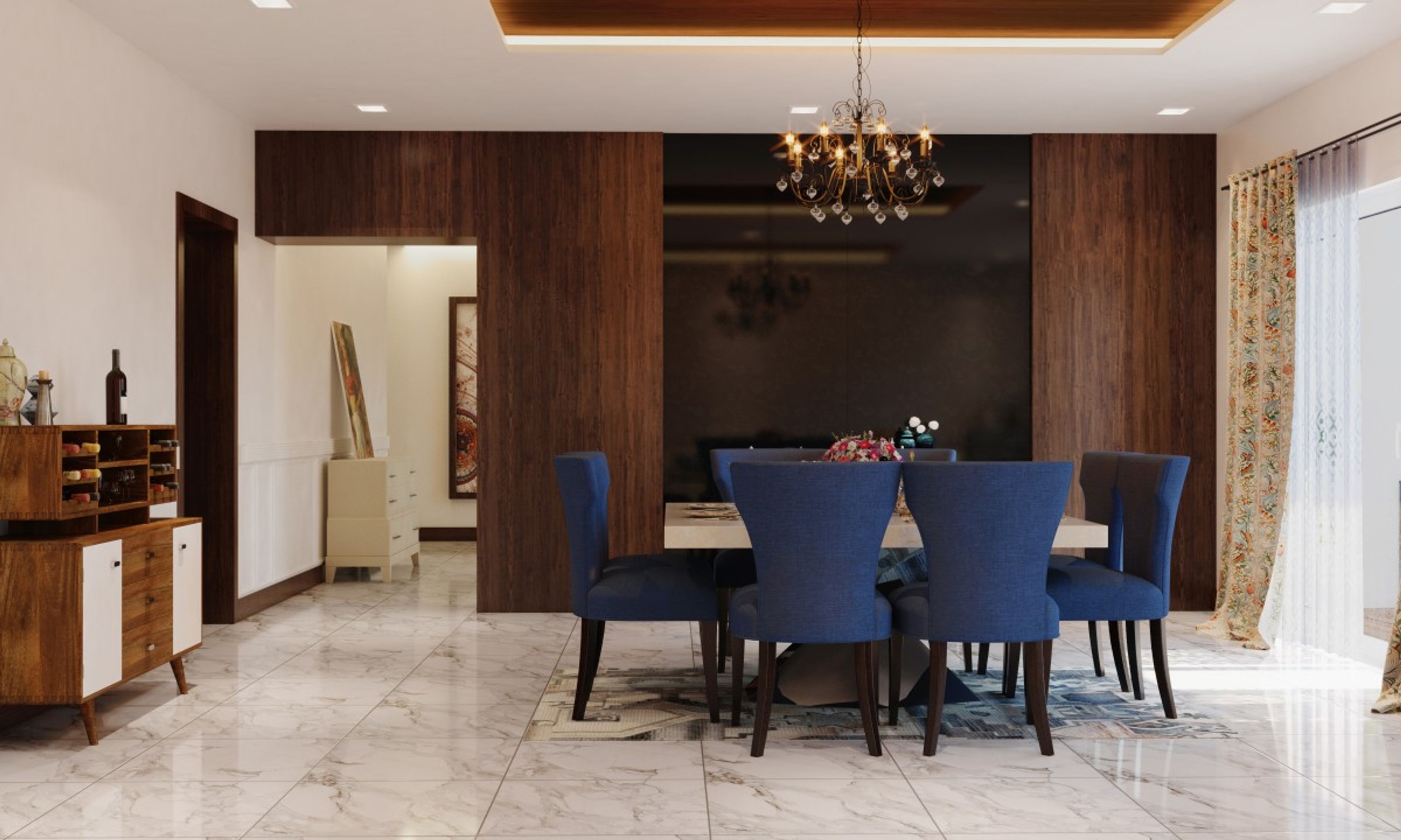 Reminiscent of the posh interiors of a palace, this regal dining room is a toast to luxury living.   The stylish dining chairs upholstered in navy blue goes well with the marble topped dining table and makes every dinner a  royal affair.