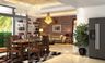 The clean lines of the no-nonsense Ashby table is encircled by modest Cornell chairs, and enjoys plentiful light streaming in through the naked windows, giving the eye an illusion of space.   Grounded on a large, patterned rug with sleek pendants above, the dining room combines polished accents with solid forms to create a flawless, contemporary look. The Paulomi sideboard backed against the far-left wall, can house crockery in its deep compartments, while the Oorja side table and Oliver sofa blend in seamlessly.