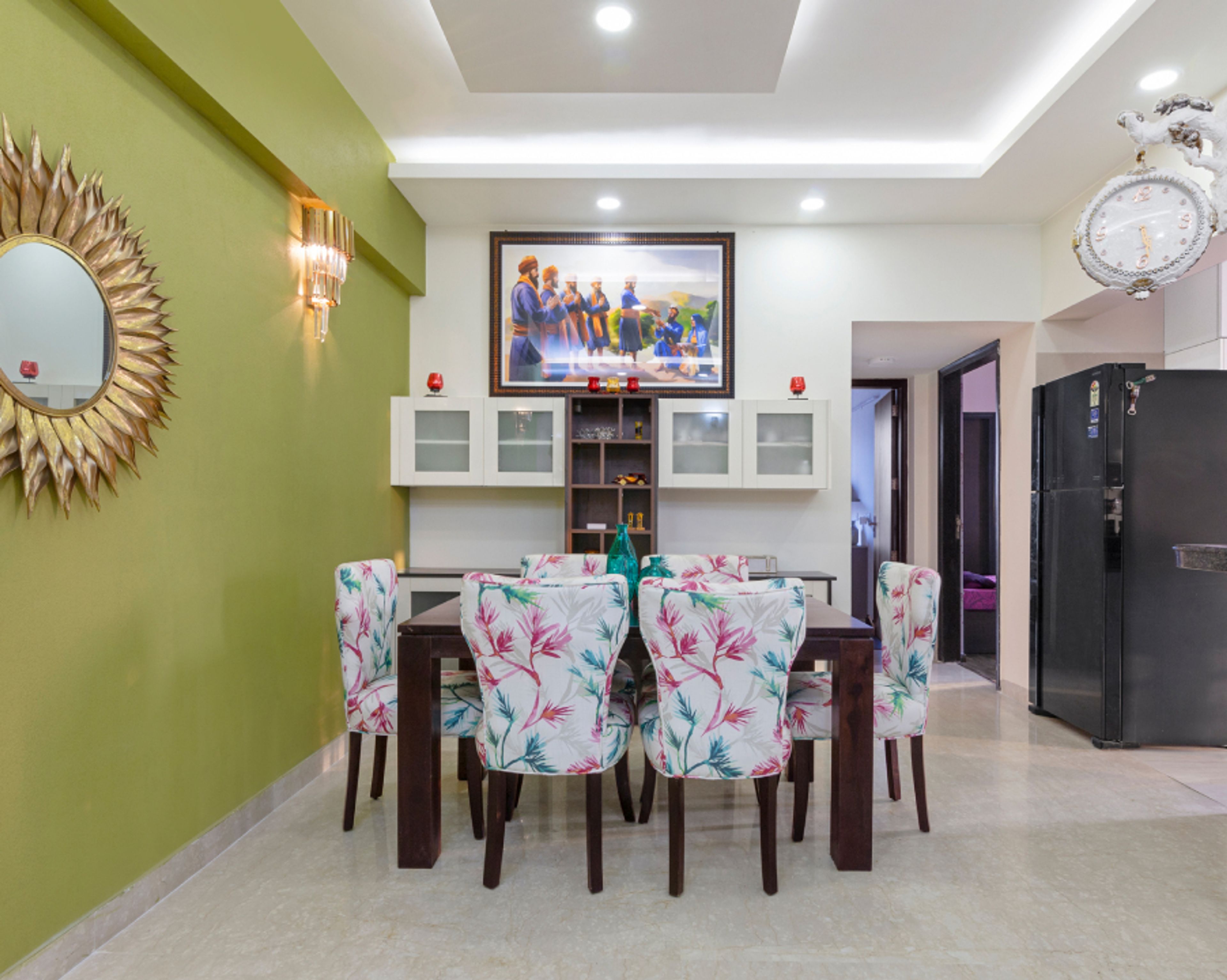 • Room Highlights: Dining chairs with colourful fabric upholstery lends the dining room a tropical look