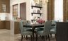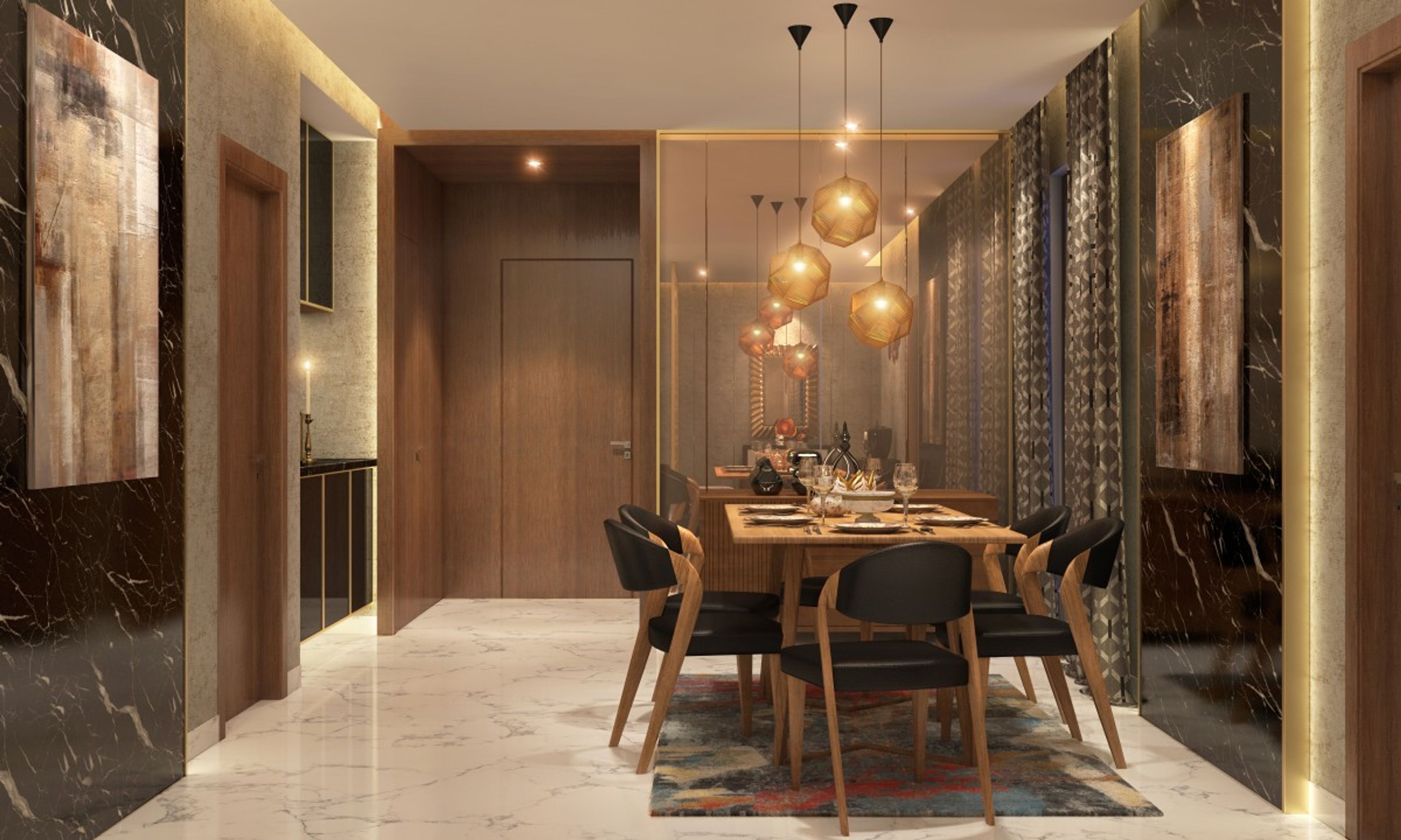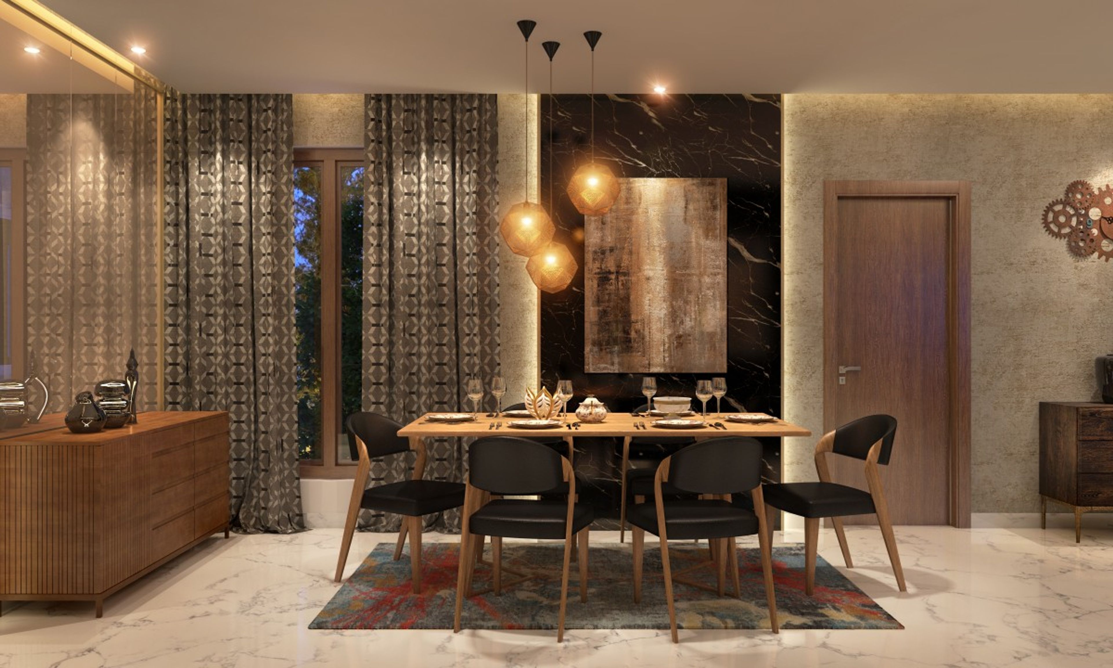 A set of cascading pendant light overlooks an impressive dining area styled with wood finishes and delectable shades of black.   The six seater dining set celebrates the beauty of straight lines and fits in perfectly with the contemporary theme.   Includes furniture, accessories, and soft furnishings, all subject to availability