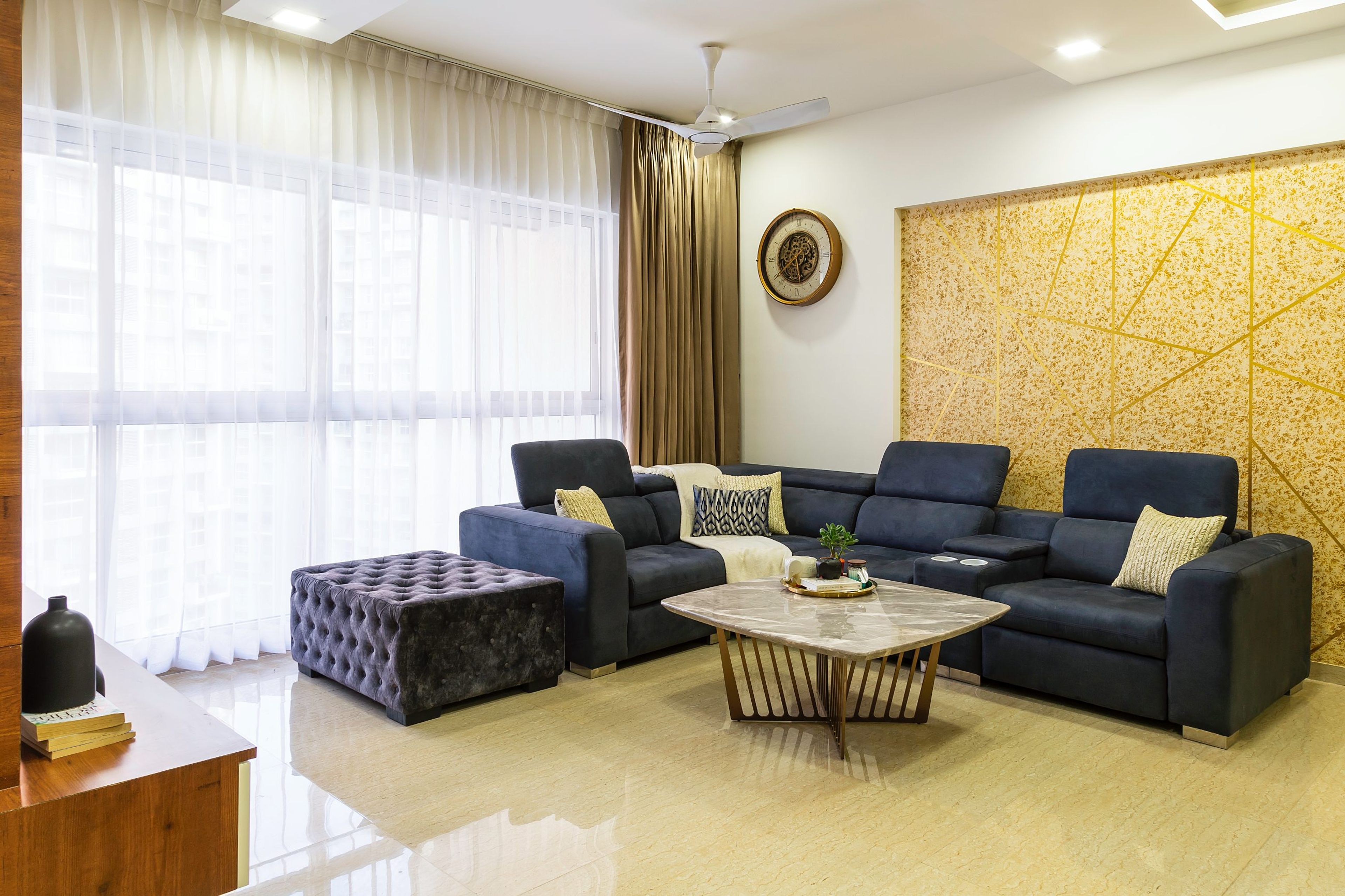 This contemporary L-shaped drop-down false ceiling with cove lights creates a focal point in the ceiling space. The light colour of the false ceiling spreads brightness and makes the room appear bigger.