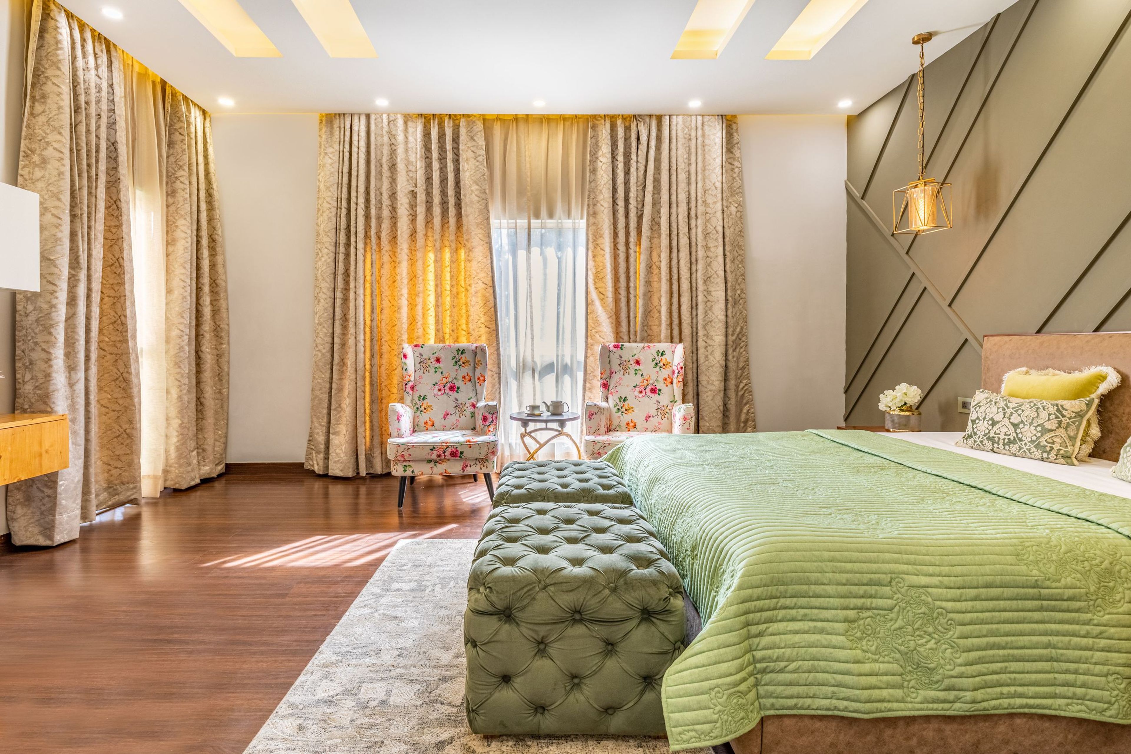 This modern central drop gypsum false ceiling looks exquisite and can make a perfect addition to your rental property. The central drop with the contrast-coloured fan looks beautiful. The warm strip and cove lights lend style and ample lighting to the space.