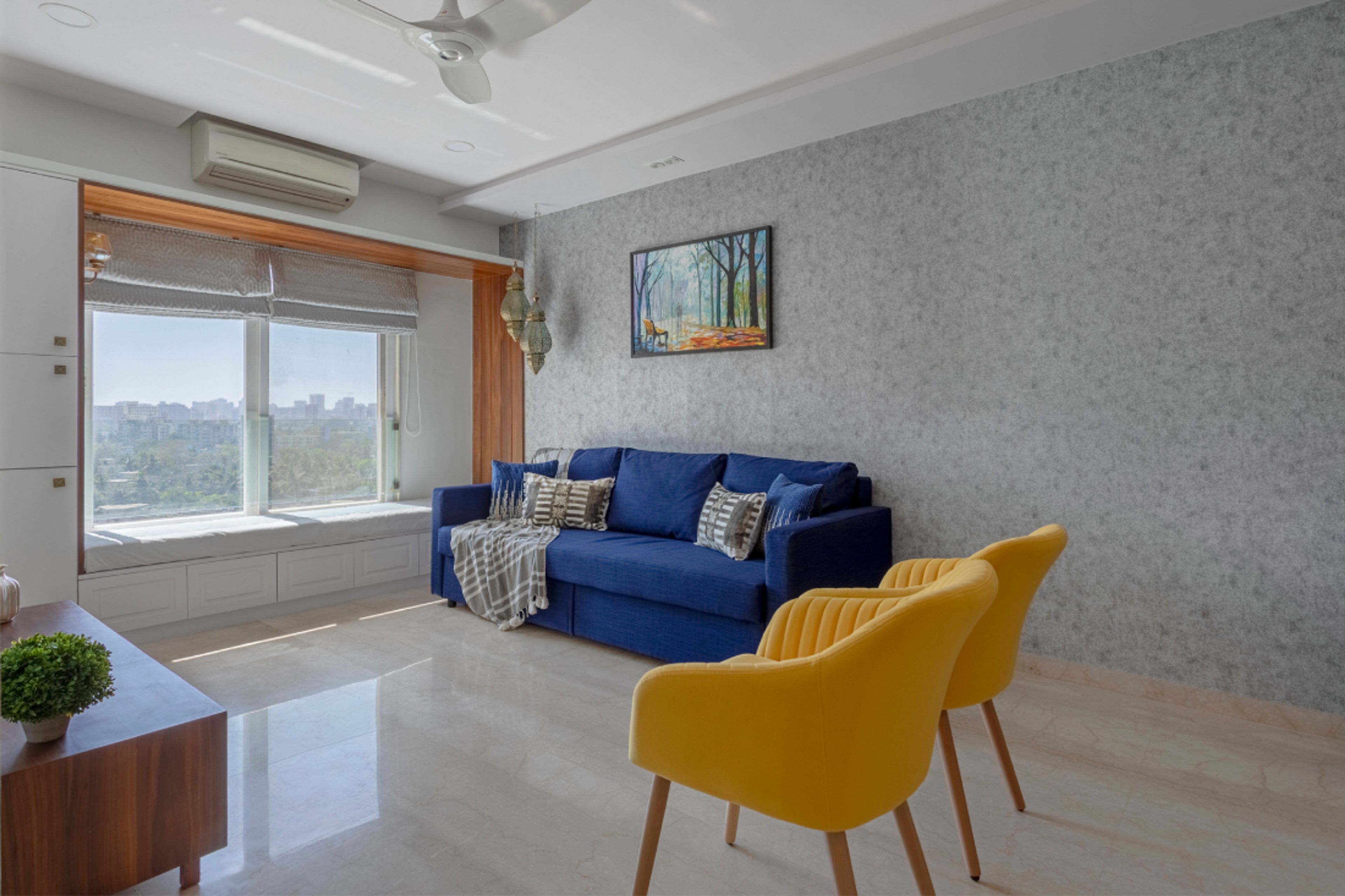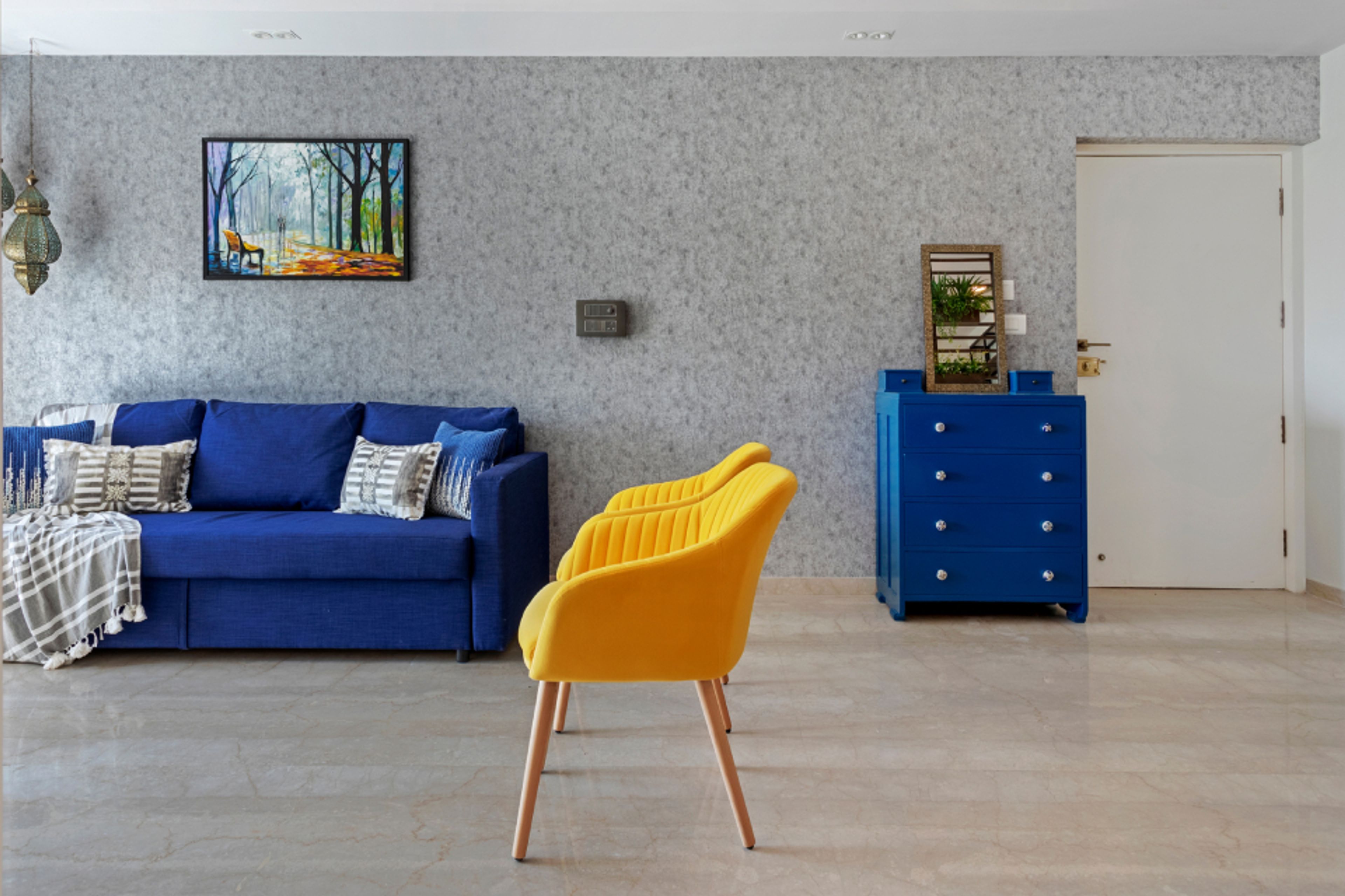 • Blue sofa and the yellow accent chair adds a pop of colour to the room