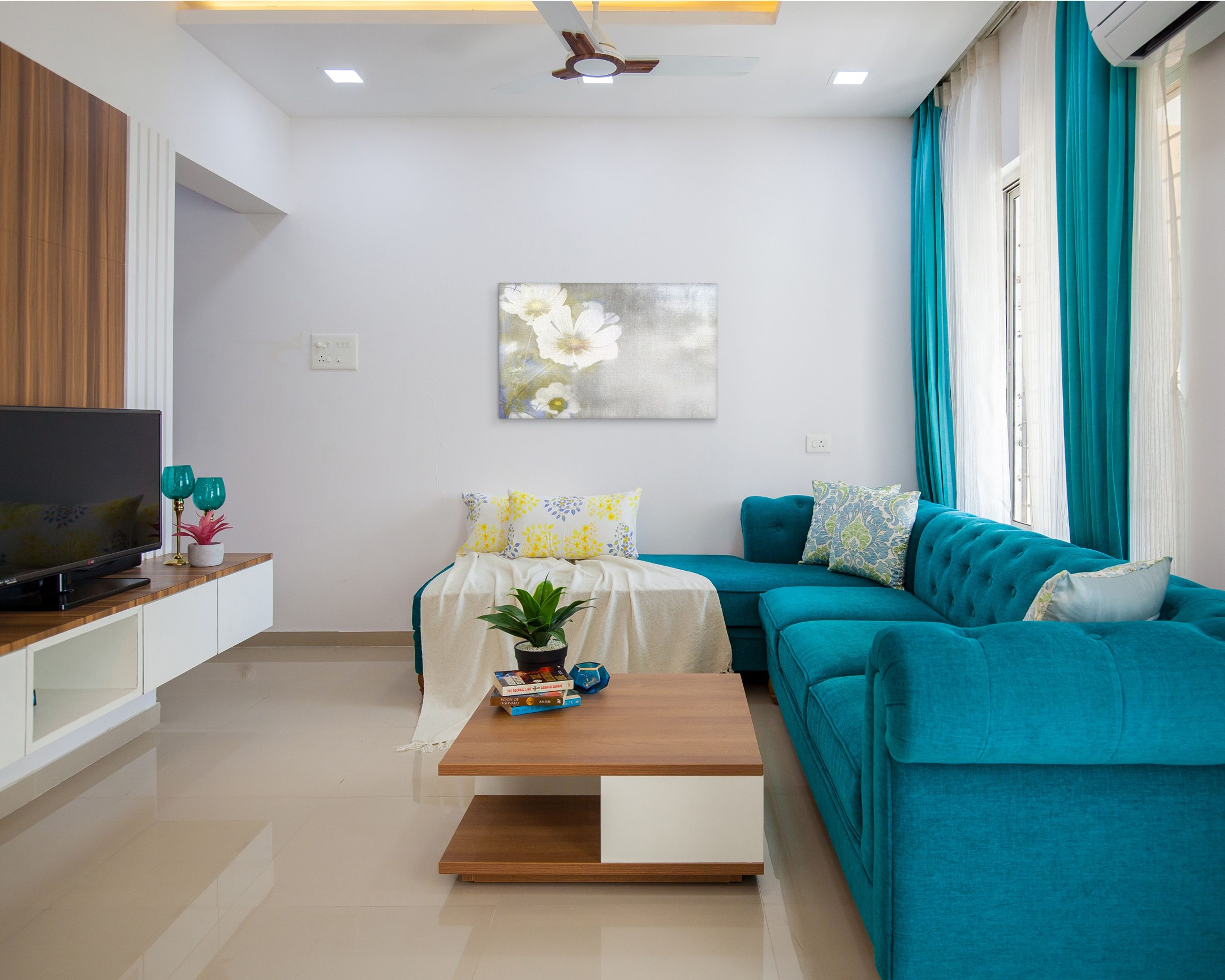 • Blue sofa adds contrast to the flooring design
