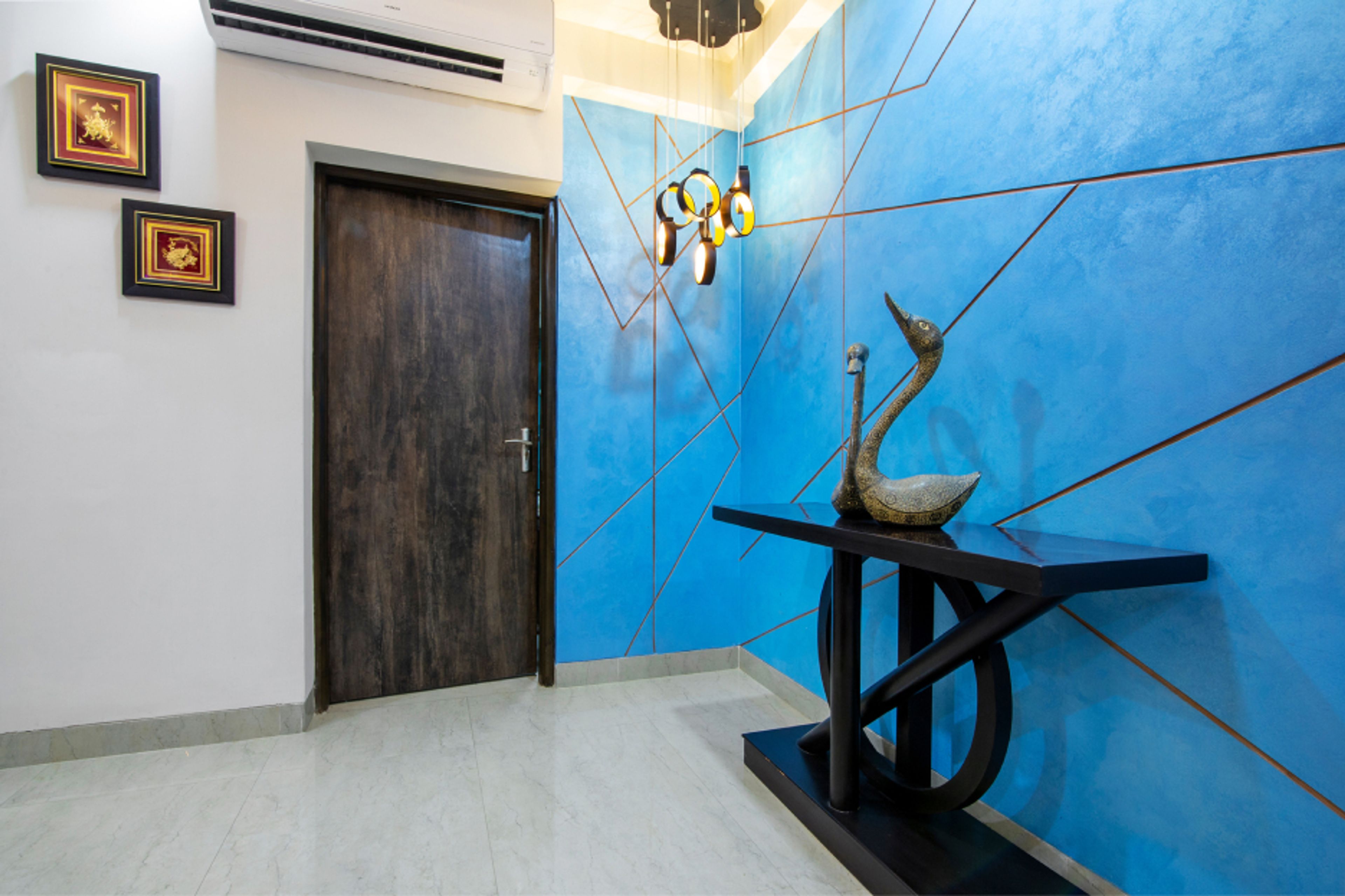 1. The blue textured wall paint with the wall trims gives the foyer design a serene aesthetic