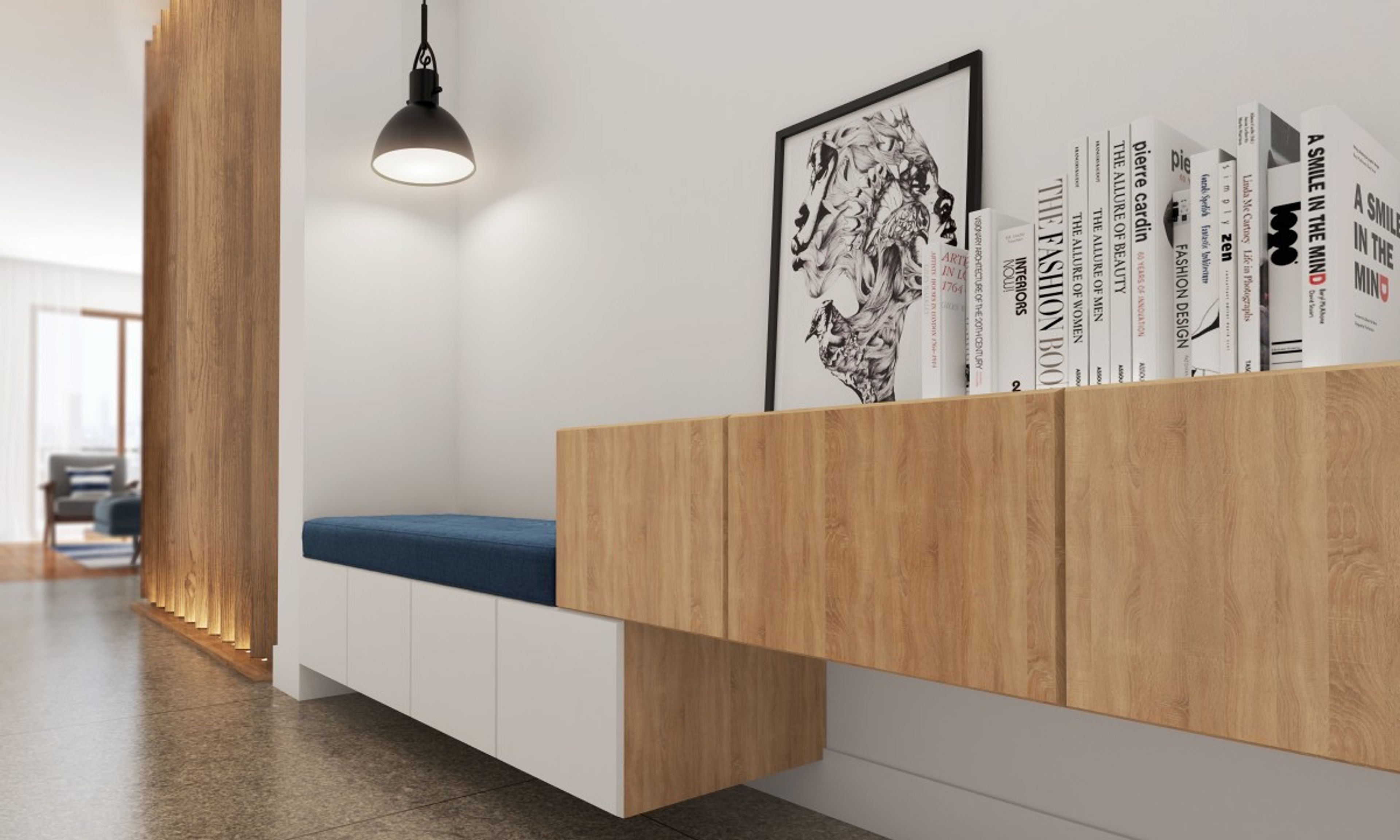 This uber cool is a treat for the eyes with ceiling-to-floor open shelves along one side and scintillating art on the other.   Pristine white display shelves work well with crisp white walls. Slender track lights light up the foyer and act as spotlights for the artwork on the parallel wall.