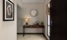 A gorgeous multi-panel mirror works as a statement piece against the neutral wall in this contemporary entryway.   The twin-level cabinet beneath is adequately spacious to house all your family’s footwear — provisioned to be removed right at the gate, in tune with the popular Indian tradition. The vibrant Kashi pouf facilitates the same as it becomes a convenient sit-down spot, all the while adding richness to a space dominated by new-age browns. The accent pieces, in the spirit of a glitzy welcome, are all chosen in a warm yet glamorous palette.