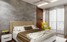 This is a contemporary modern bedroom setting with a compact look that gels perfectly with your wardrobe. The wardrobe is designed with sliding shutters to add some extra space to the bedroom. The contemporary art works and the curtains add the extra colour and vibrance to the room.