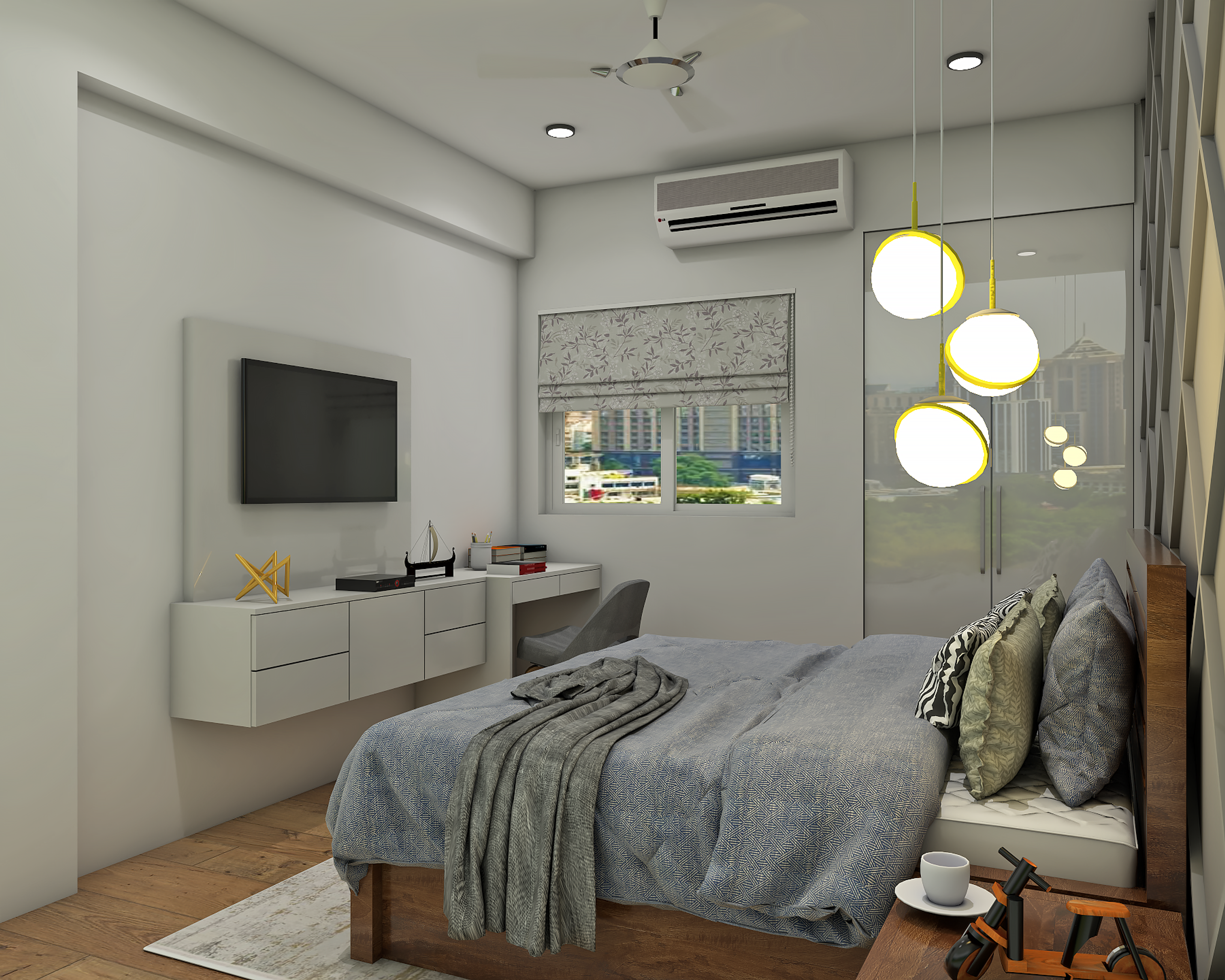 With an effective modular design, this contemporary and compact layout for the bedroom effectively uses the available space. The integrated TV unit, study unit and wall trims behind the bed elevate the design and aura of the bedroom. White colour palate on the doors and wardrobe shutters makes the space soothing and lighter.