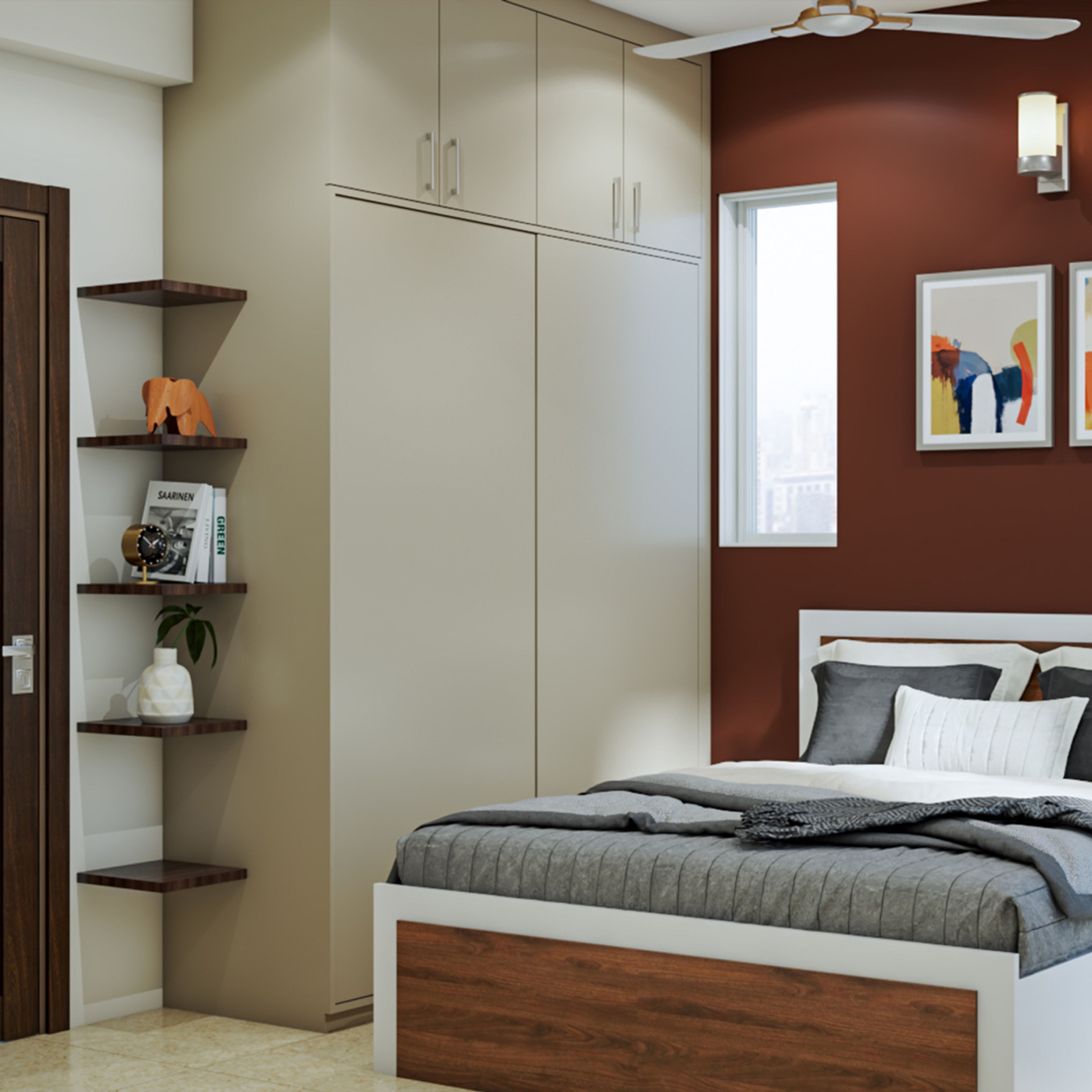 This guest bedroom design with a dark brown accent wall creates a welcoming space for your guests. The sliding wardrobe is perfect to store their belongings while the open ledges on the side of the wardrobe can be used to display decorative items. The wooden bed with white carcass also adds a stylish look with grey bed furnishings adding to the elegance.
