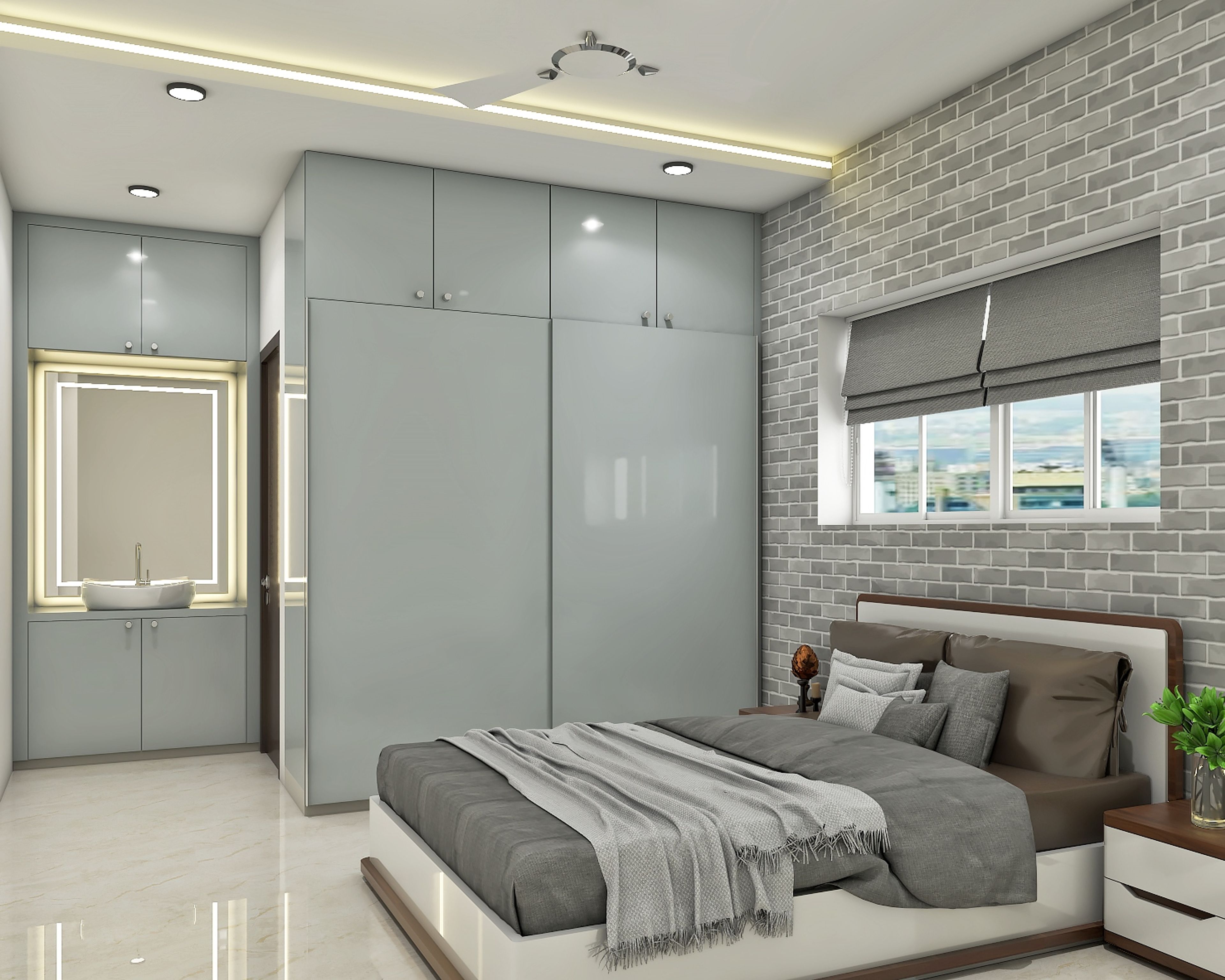 • Room Highlights: Rustic grey bedroom design with multi-layered false ceiling and spacious sliding wardrobe