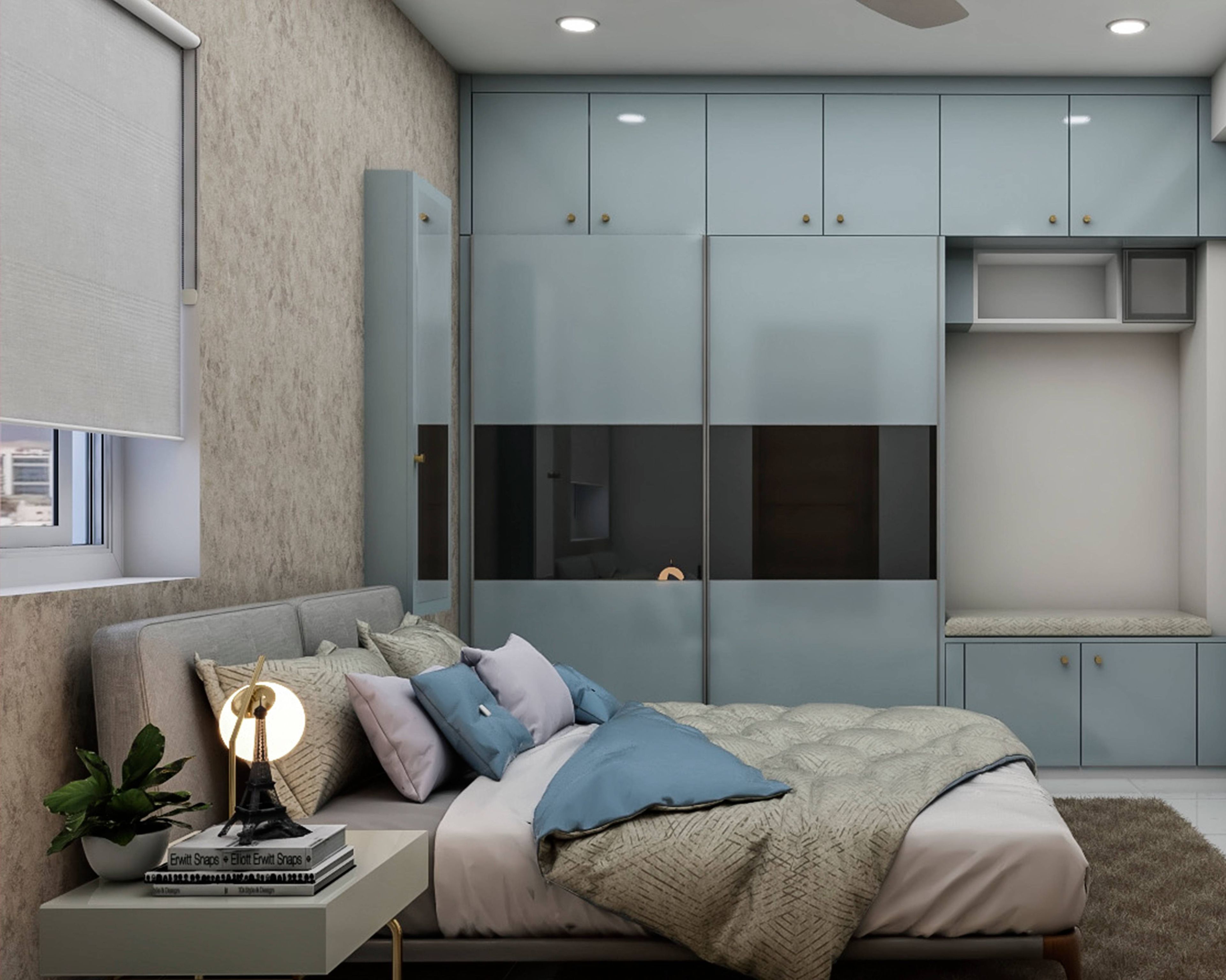 This modern guest room design is lit with ambient lighting. It's spacious and comfortable. The subtle colour palette complements the wardrobe design.