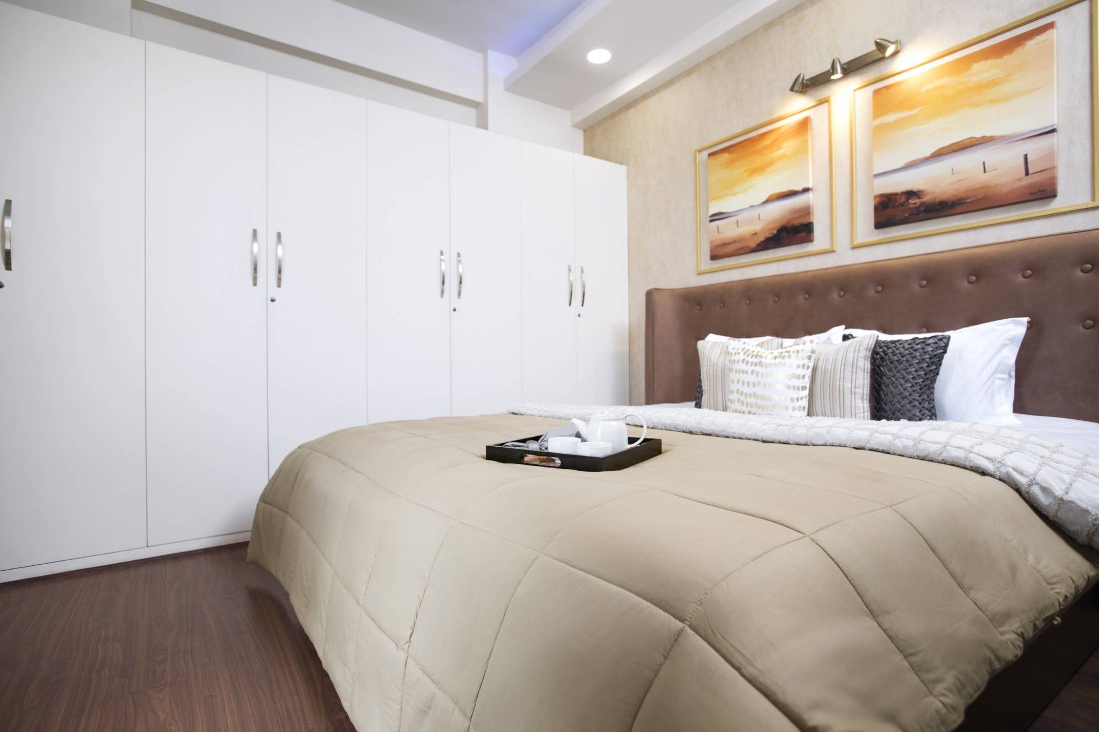 • Room Highlights: Neutral-toned room, with a contrast brown headboard