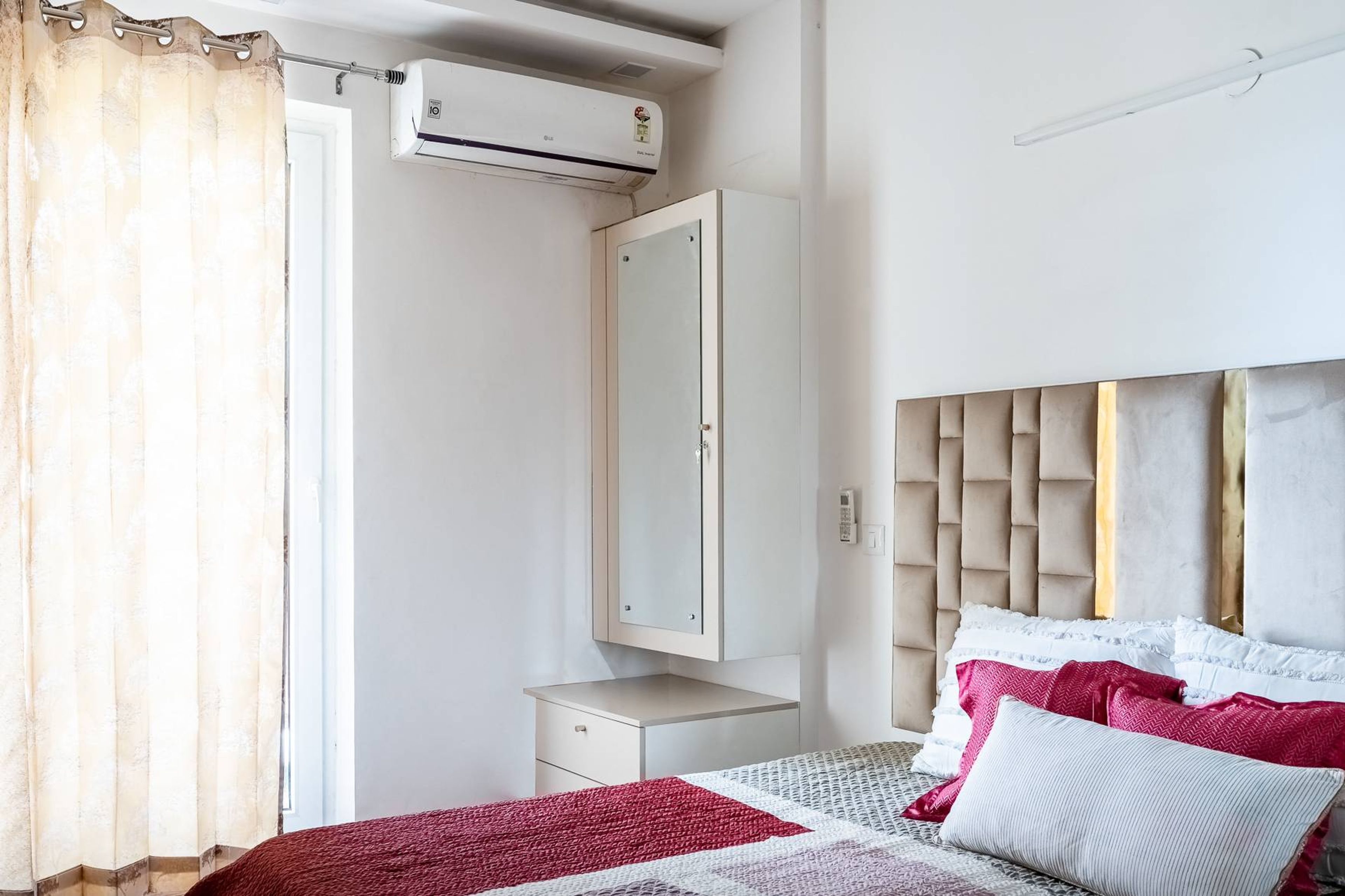 • Room Highlights: Apart from storage purposes, the mirrored wardrobe helps brighten up the space by reflecting light and adding depth to the room.