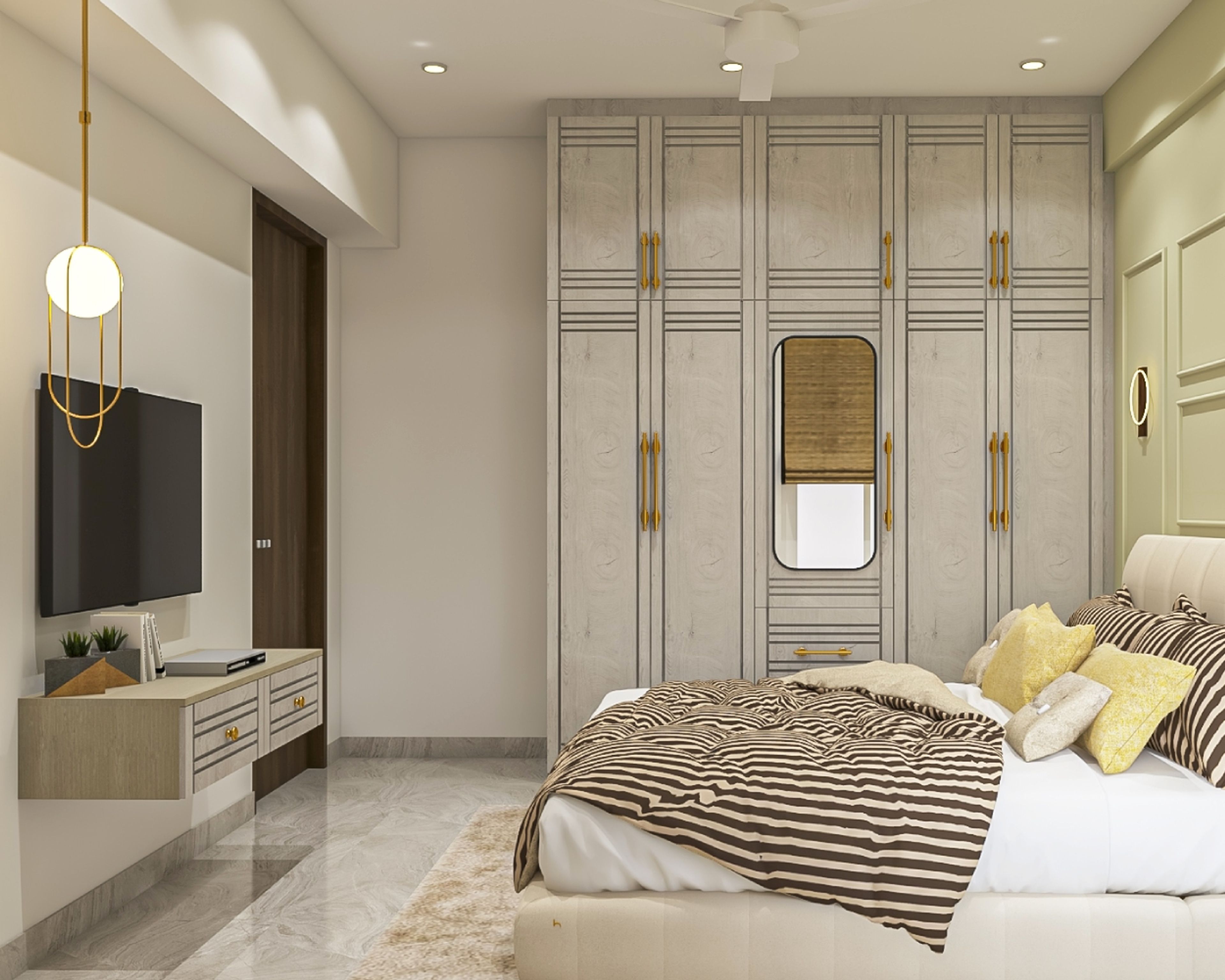 - The rustic pattern and colour scheme on the wardrobe and the TV console offer visual respite, giving the room an interesting focal point.