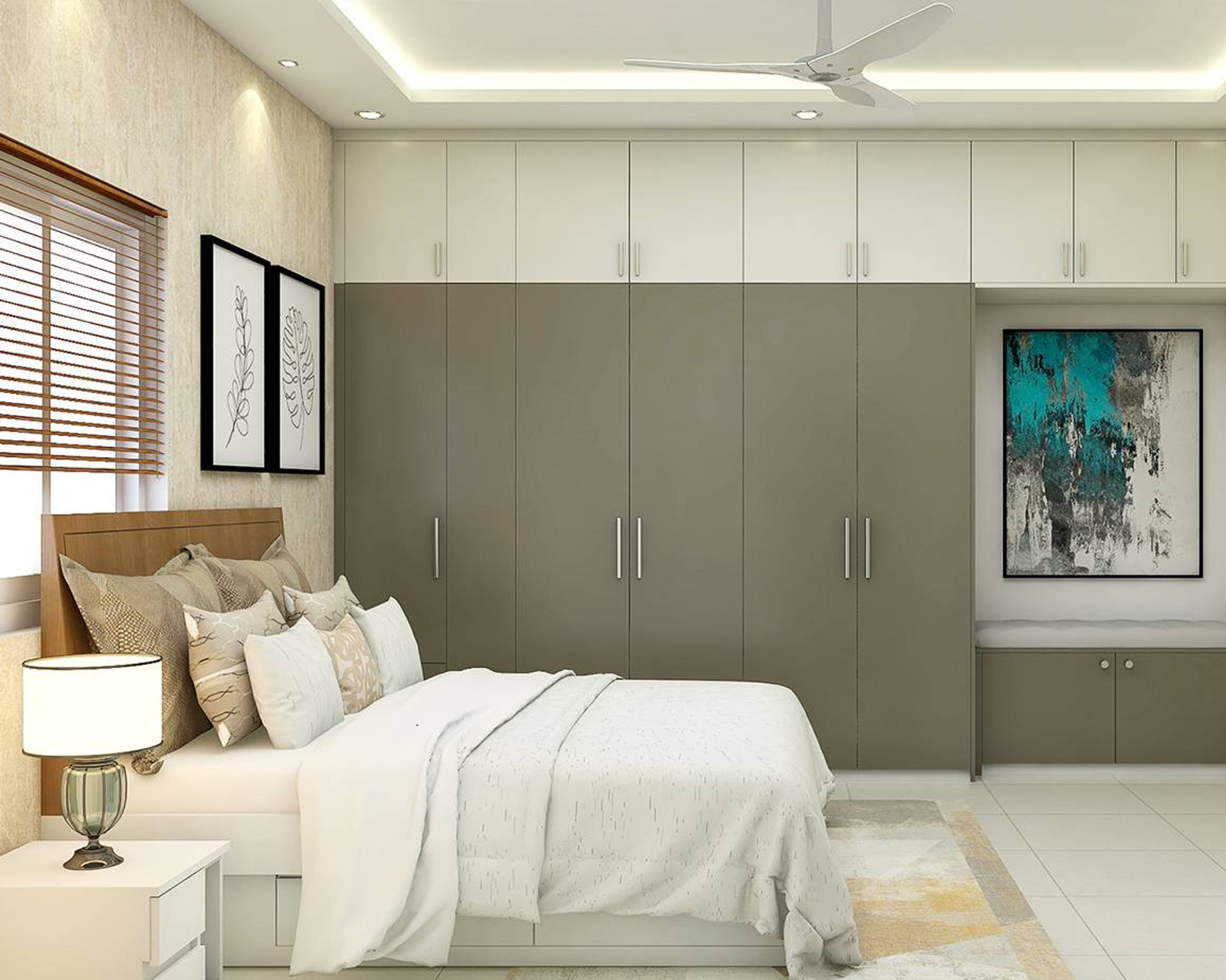This modern guest room design is spacious, further augmented by the white and grey tones. The wooden headboard complements the room's motif. The white colour temperature lighting illuminates this room. There is a niche seating space with a grey and white palette for a pretty look.