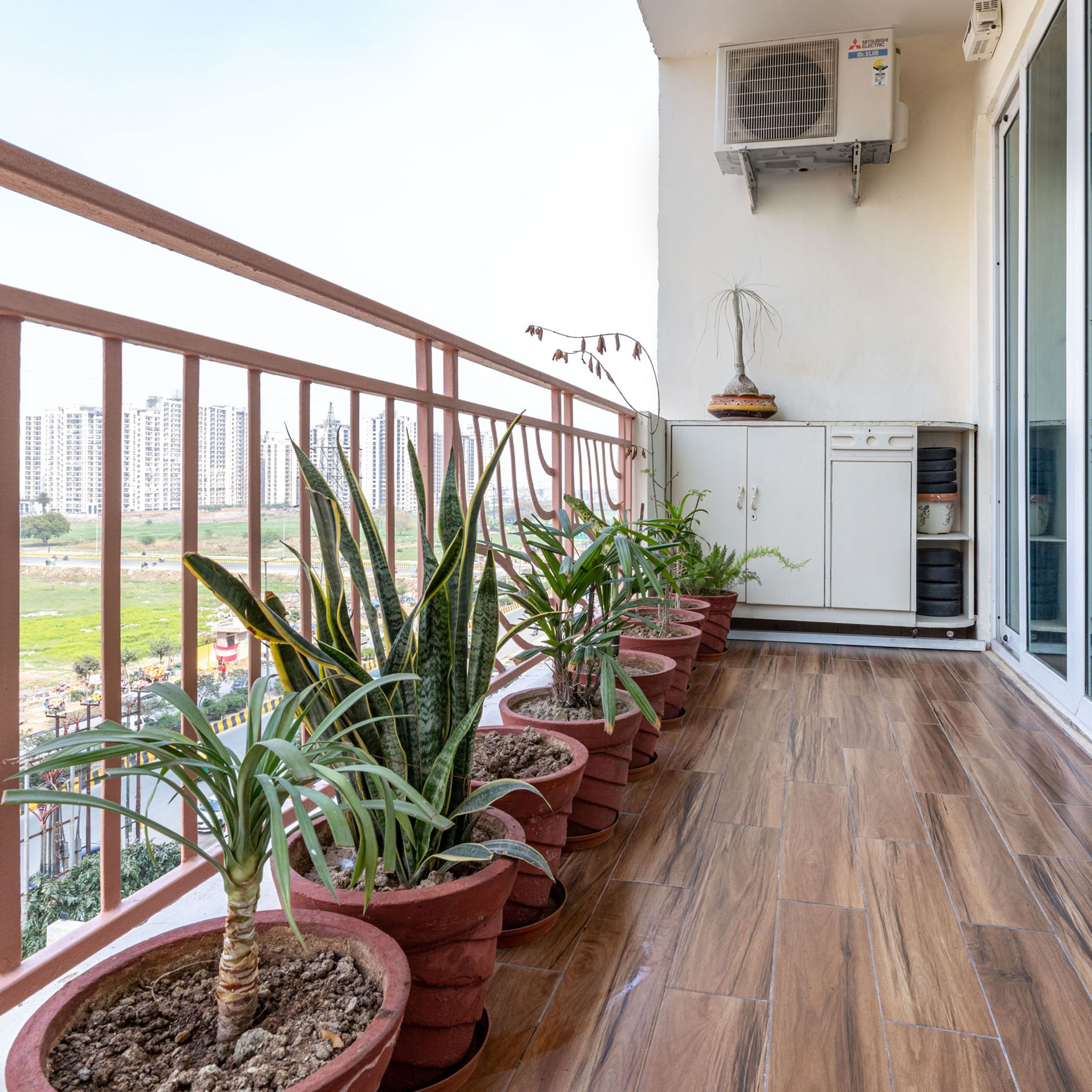 Step out onto our spacious balcony, with stunning wooden flooring and a white storage unit, perfect for enjoying the fresh air and sunshine. Experience the ultimate in style and comfort with our beautiful house design.
