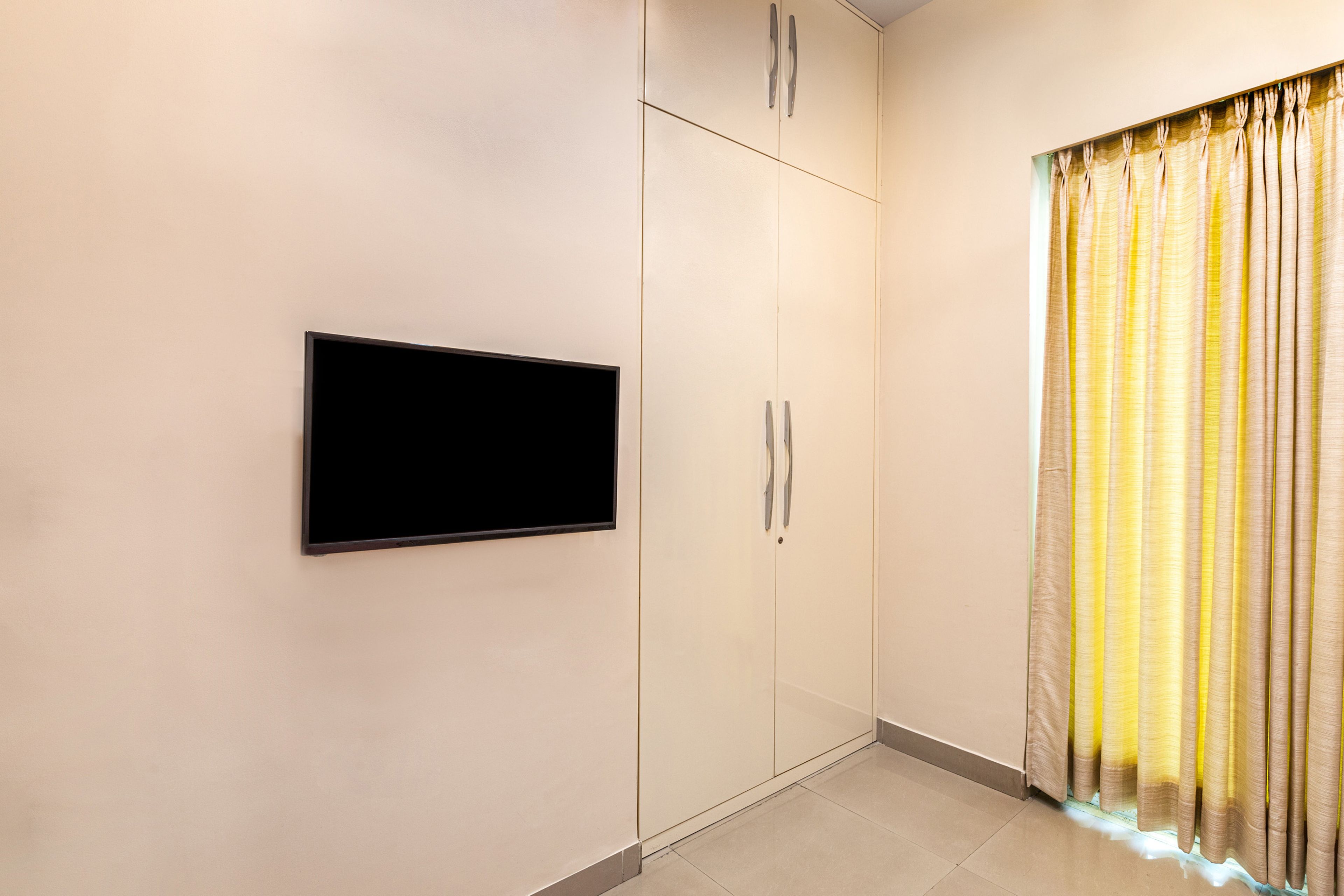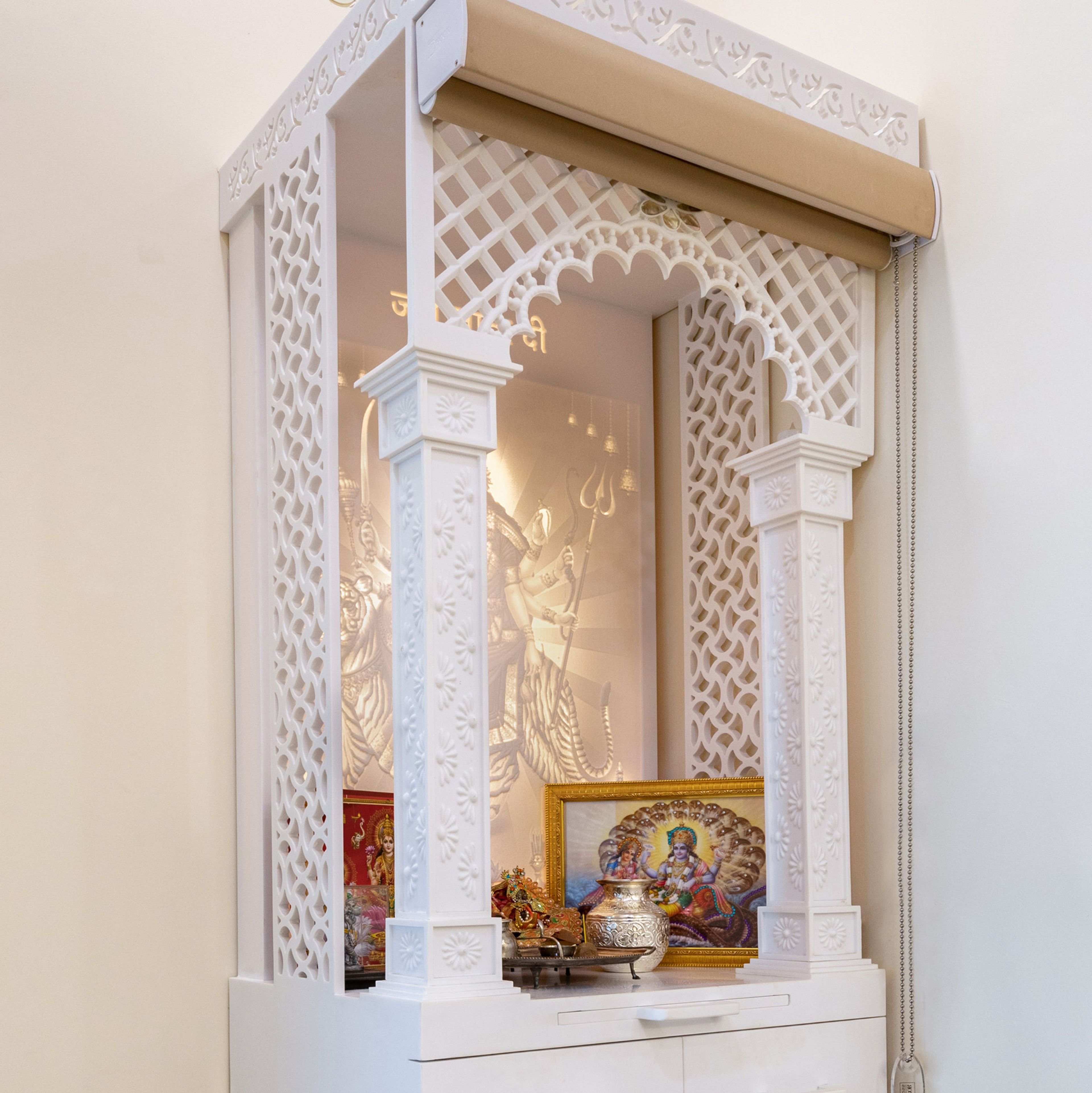 Our house boasts a beautiful white mandir design with CNC jali pattern, providing a serene space for prayer and reflection. The compact master bedroom features a cozy brown bedding, wooden flooring, geometric wallpaper, and a brown and cream wooden wardrobe, complete with a TV unit for your entertainment needs.